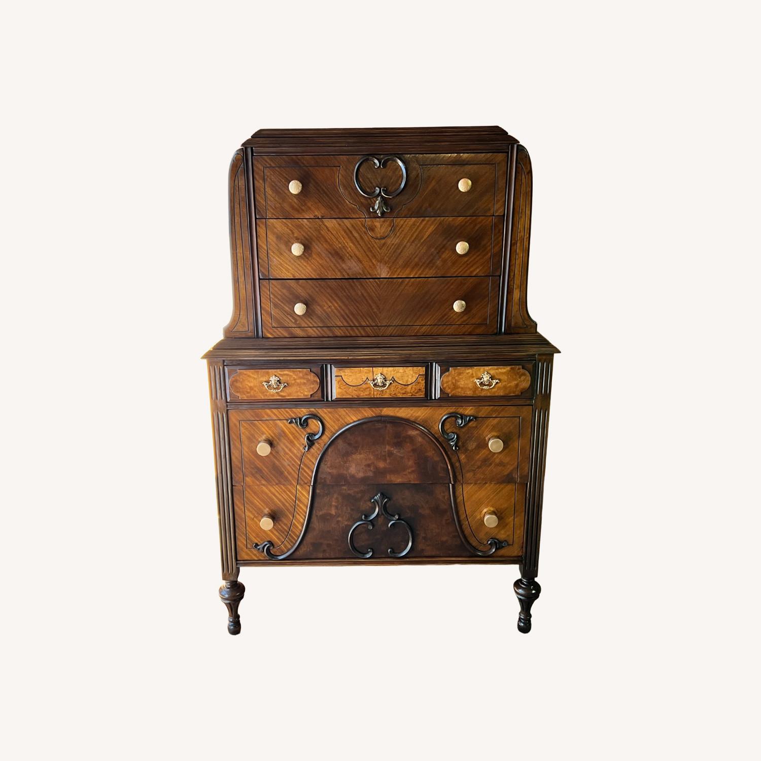 Seller's Notes:Elevate your space with this professionally refinished antique highboy dresser. This rare 1930s Art Deco "Beauty and the Beast" style piece is a showstopper, featuring high-contrast wood grain and ornate architectural details. Features: Dimensions: - 55 inches High - 36 inches Wide - 20 inches Deep Craftsmanship: Solid wood construction with classic dovetail joints for lasting durability. Elegant Design: Striking book-matched veneers, burl inlays, and dramatic dark wood scrollwork. Hardware: Features beautiful vintage-style knobs and pulls. Condition: Professionally refinished to highlight the natural glowing finish of the wood. This unique tallboy offers ample storage with 8 drawers (3 medium top drawers, 3 small middle drawers, and 2 large bottom drawers), combining historical elegance with modern functionality.