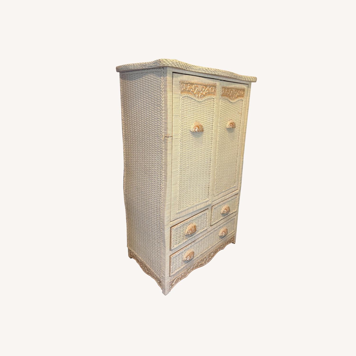 Seller's Notes:Beautiful vintage/ antique wicker armoire with wood carving details. Comes as part of a complete bedroom set with a headboard, dresser and nightstand. The woman I bought this set from said it was hand carved wood from Italy. Doors and drawers all work well, no functional issues. Minor discoloration