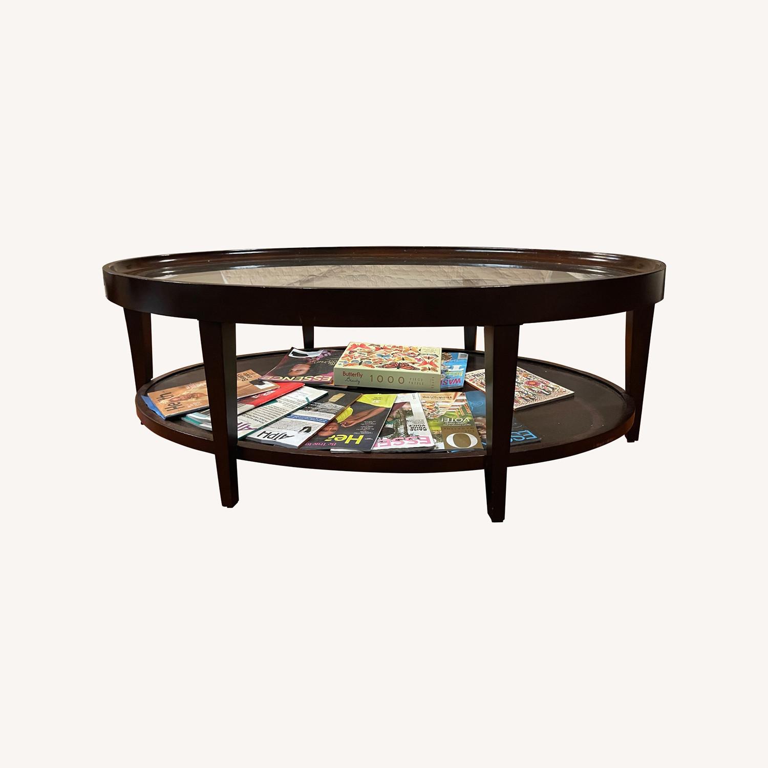 Seller's Notes:This item has been with our family for many years and still has some life to live. It is wooden and has a glass top with an open storage section towards the bottom. It has a wobbly leg, but just needs some tightening.