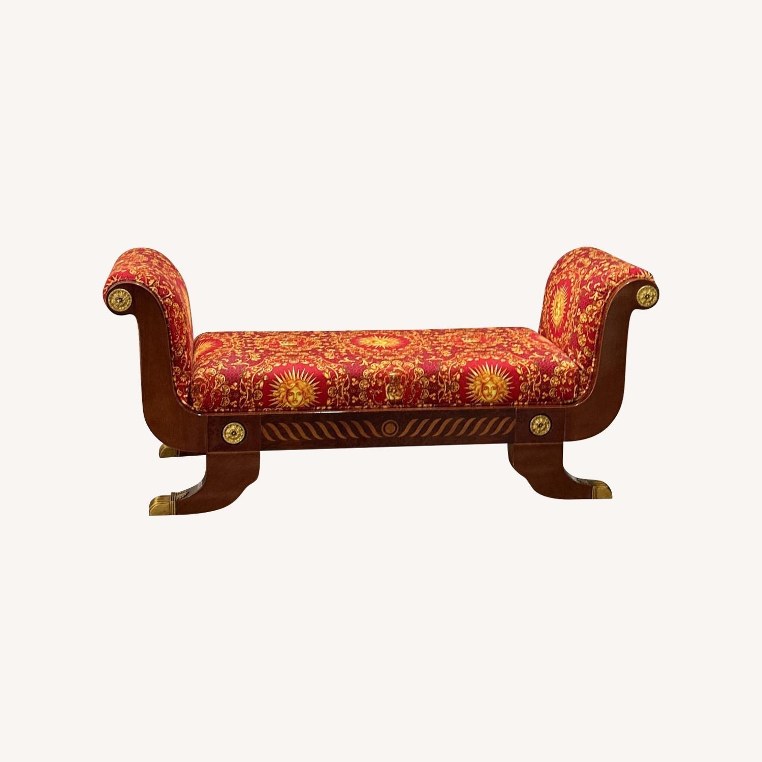 Seller's Notes:Seller's Notes:This is a super well-made carved wood bench for your bedroom. Fabric is patterned and very clean. Ready to use condition. ***Crack at the bottom of one of the arms***
