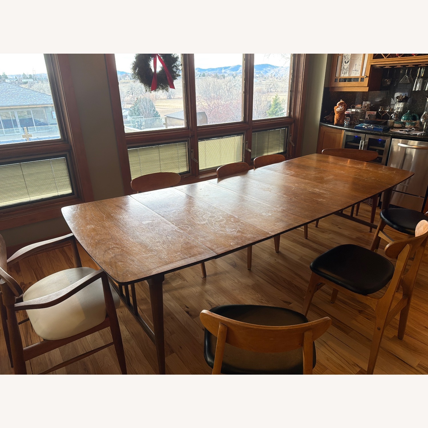 Seller's Notes:Vintage table with 4 leaves.. can go down to as small as 36 inches in length. 7 vintage chairs that have no side arms and are black. Two captain chairs that are ivory… needs to be touched up on table top surface but it’s a vintage 1970’s walnut table!!