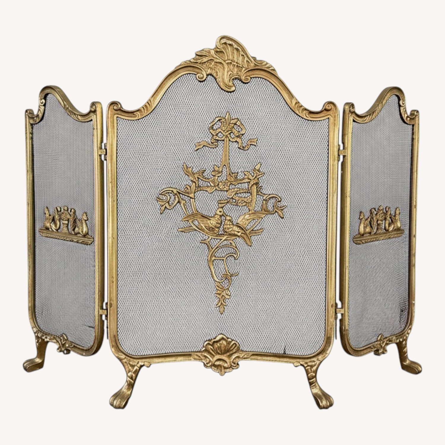 Seller's Notes:Magical Louis XV Style Folding Brass Fire screen, fold in 3 sections, brass frame with screen panels with cast brass designs in the center. Stunning piece with birds scenes. 18.5 INCHES WIDE CLOSED