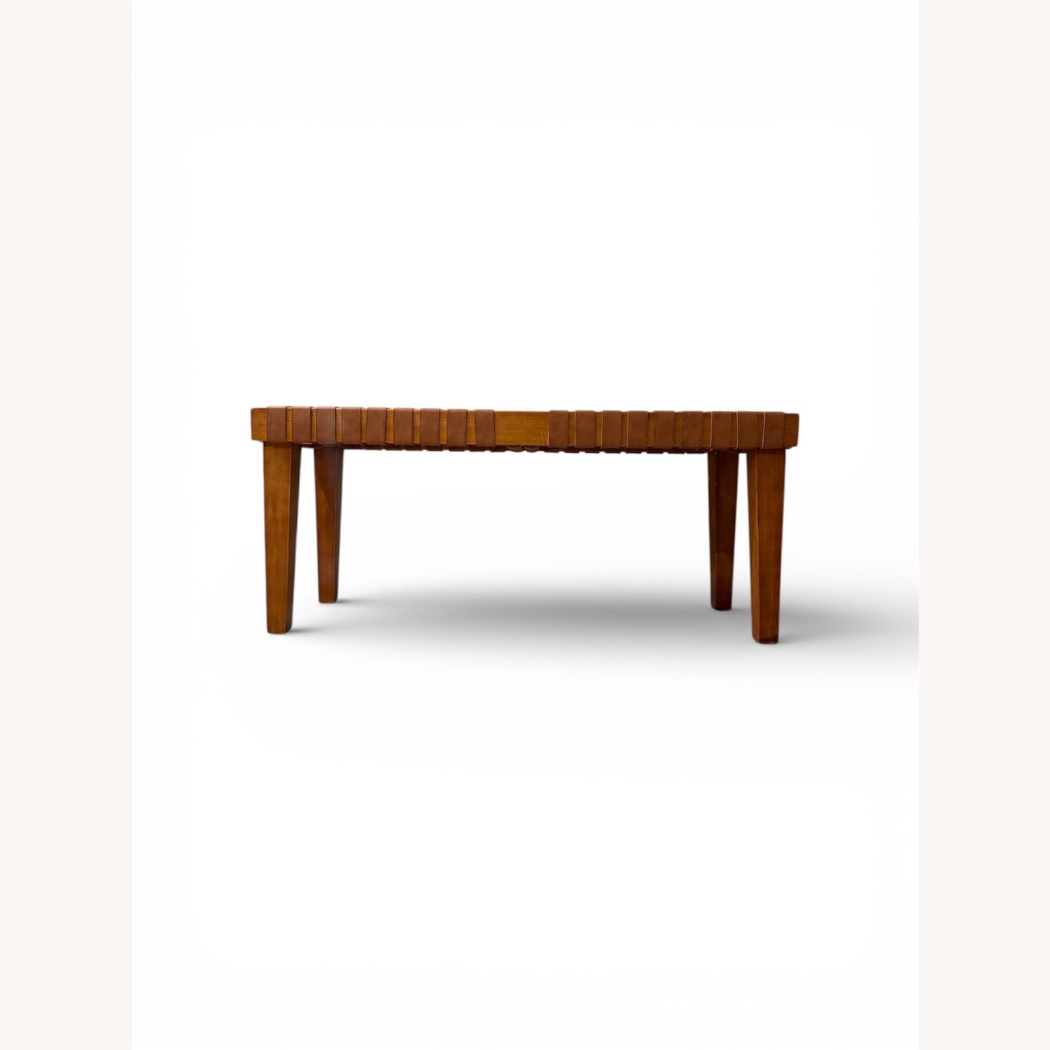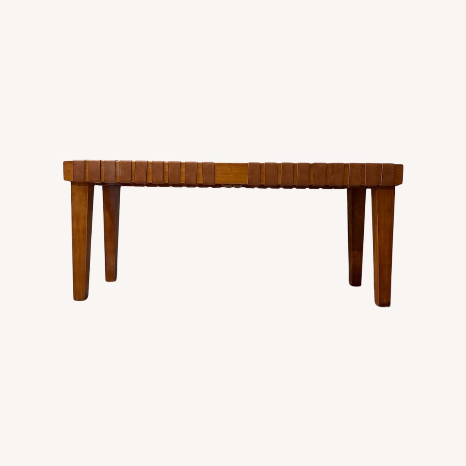 Seller's Notes:This refined two-person bench features a handwoven leather sling seat crafted in an interlaced leather strap (basket-weave) construction, set atop a solid wood frame. The warm, natural leather straps are tightly woven to create a supportive yet flexible seating surface, while the sturdy wooden legs provide clean lines and lasting durability. The combination of vegetable-tanned leather and solid hardwood gives this bench a timeless, architectural presence—ideal for an entryway, bedroom, living space, or at the foot of a bed. Its low-profile design and artisanal craftsmanship make it both functional seating and a sculptural accent piece. Technical Details: • Seating Type: Interwoven leather strap (basket-weave) sling seat • Frame: Solid wood / hardwood construction • Capacity: Two-person bench • Style: Mid-century modern, rustic modern, artisan • Condition: Excellent, gently used A classic, well-crafted bench that balances form, function, and natural materials—designed to age beautifully over time.