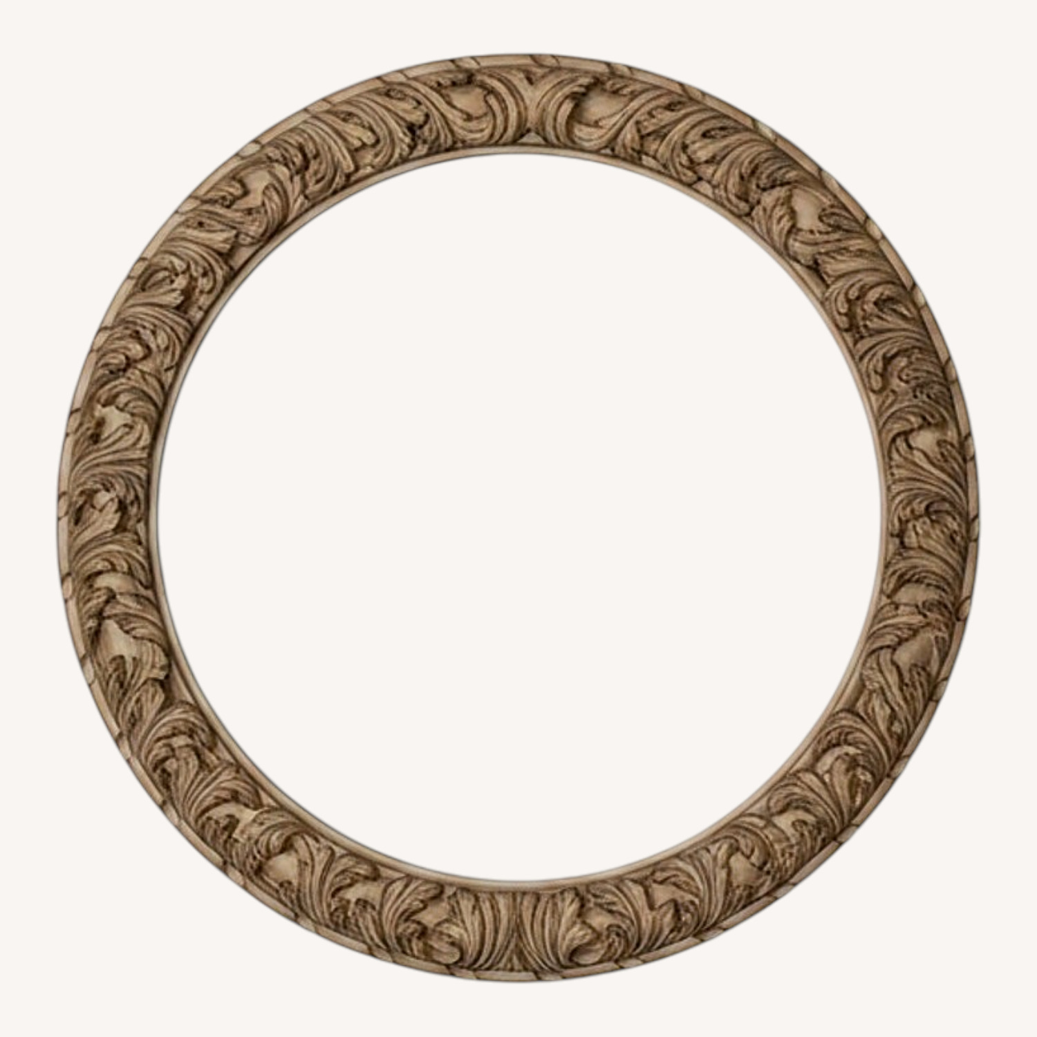 Seller's Notes:Beautiful round mirror approximately 38” with three dimensional wood like cut outs. Frame is approximately 5” wide.