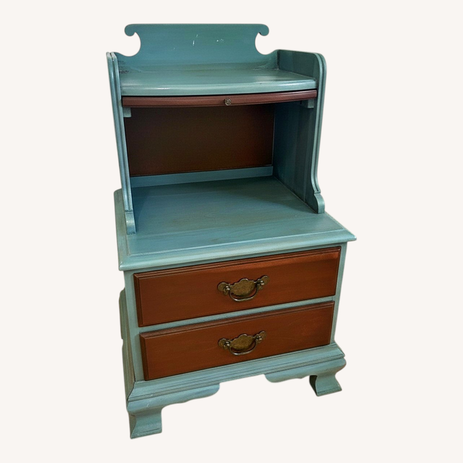Seller's Notes:Mid 20th Century Pennsylvania House, all wood nightstand/ side table with teal and cherry stain finish. In fantastic shape. Two drawers move smoothly with dovetail joint construction.