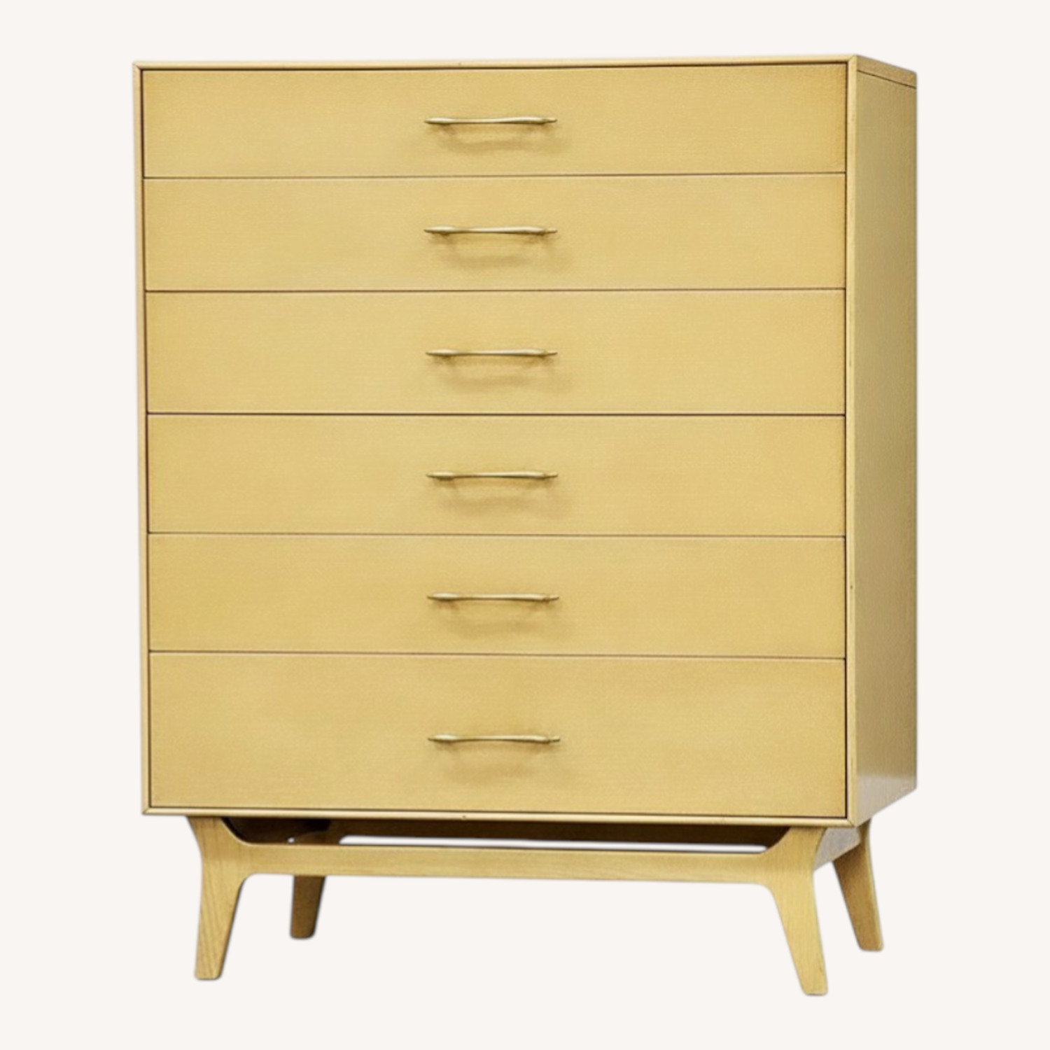 Seller's Notes:A mid century modern oak tall dresser with canted legs and brass drawer pulls made by RWAY Furniture. Original finish is in excellent condition with minor marks and minor wear. Made in the USA. Circa 1960’s. Unmarked.