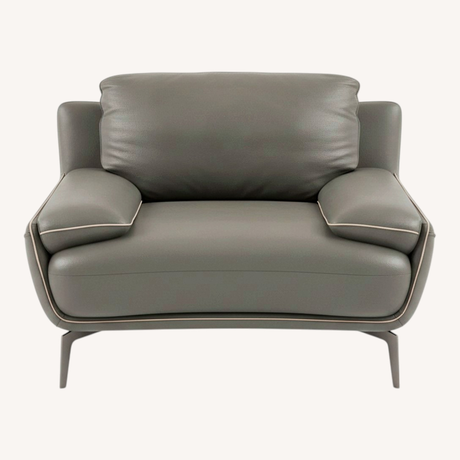 Seller's Notes:Violino mid century modern arm chair in light gray all leather. Has removable legs and measures 48 in wide and 28 in tall with a 35 inch seat depth. Has contrasted welting. This chair matches a 90 inch sofa that is also available and for sale. This unit was made in 2020 and was sold at Macys in New Jersey. Chair is in excellent condition. A great set for an office or a cool cosmo room. Very clean and very modern.