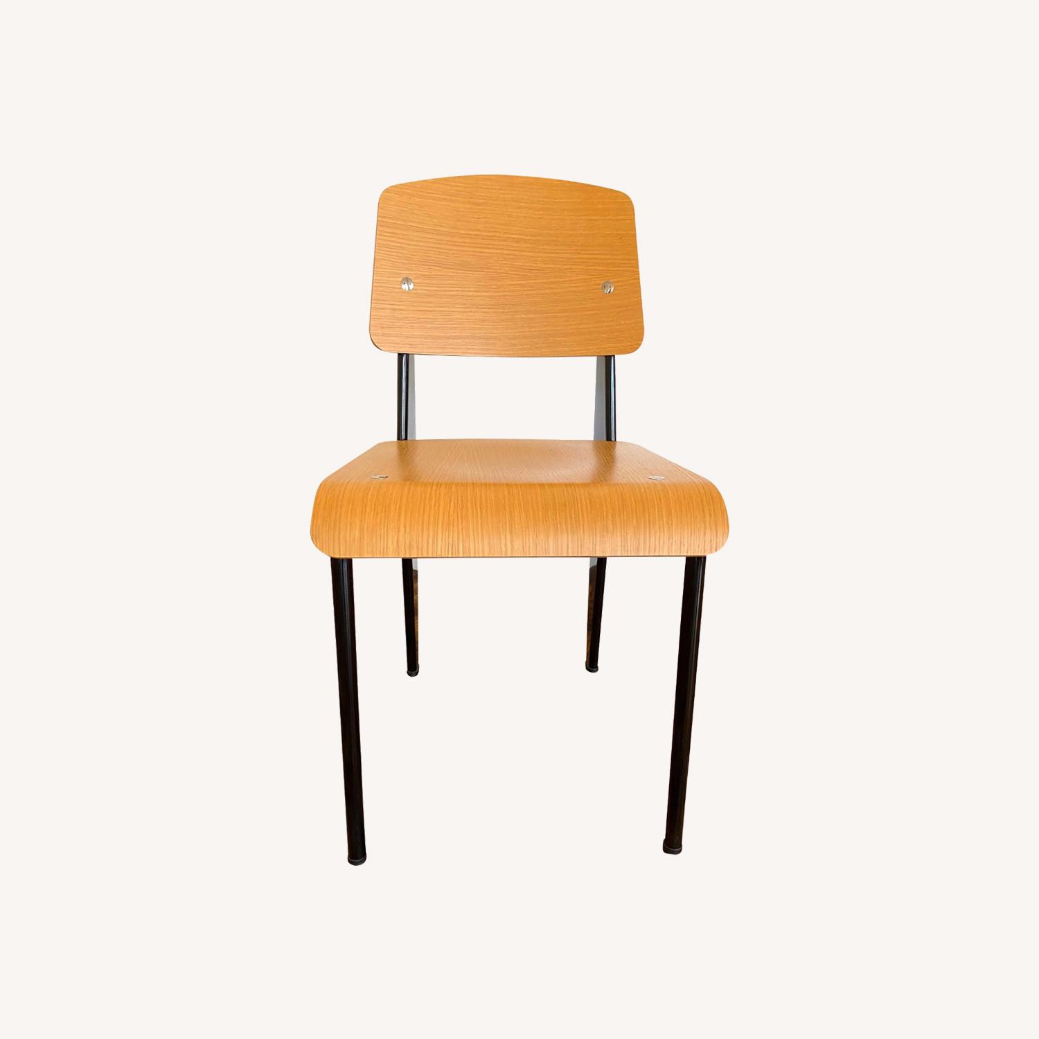 Seller's Notes:The Vitra Standard Chair was originally created by the French designer, architect and engineer Jean Prouvé (1901-1984), in 1934. The Standard chair, made in Germany, by Vitra, has become the classic design of the French 'constructeur'. Characterized by an aeronautic-looking pair of rear legs, this design was rooted in practicality, balance and durability. This chair is a modern classic and is featured in design museums throughout the world. Its quality is revealed in structural logic and unassuming aesthetics. Robust and functionally versatile, the Standard Chair works equally well in just about every setting. There is a small mark on the left side of the seat back. See photos for more detail. Construction notes: Seat and back in natural oak . Frame made of pressed powder coated sheet steel. 16.5" w | 19.25" d | 32.75" h | seat: 17.75"