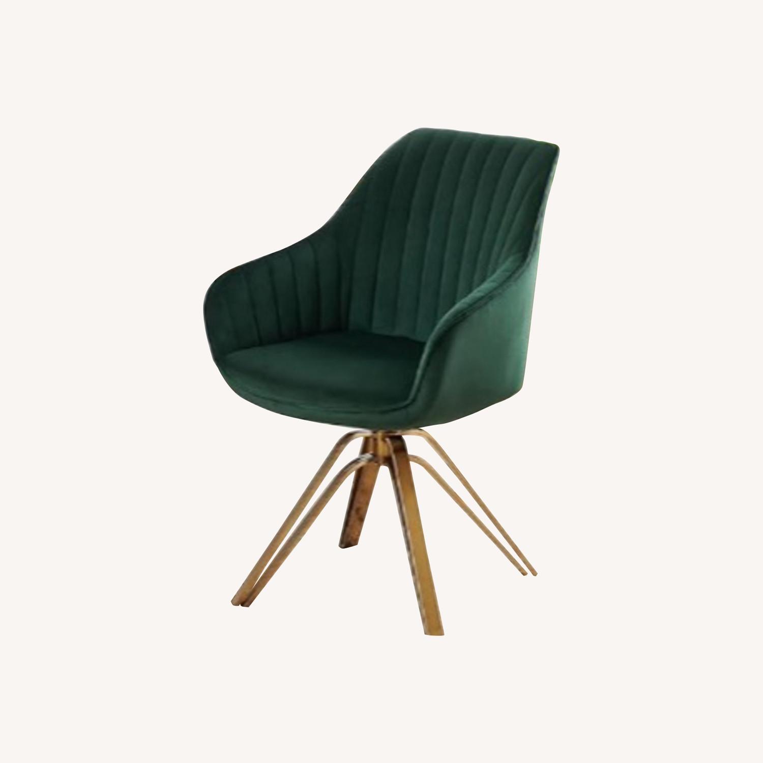 Seller's Notes:Volans Swivel Accent Chair, Mid Century Modern Desk Chair No Wheels, Upholstered Swivel Office Chair with Hollow Brushed Gold Plated Legs Office Chair for Living Room, Dining Room, Green Black ELEVATE YOUR WORKSPACE. This sleek Volans desk chair features deep vertical channel tufting and splayed, brushed gold legs for a nod to mid-century modern style with retro vibes. VERSATILITY RUNS THE GAMUT. Boasting a sleek modern look, a practical design, and a limited footprint, this will be the perfect accent chair for reception areas, casual meeting rooms, lounge spaces, vanity use, living room, or simply your WFH upgrade.