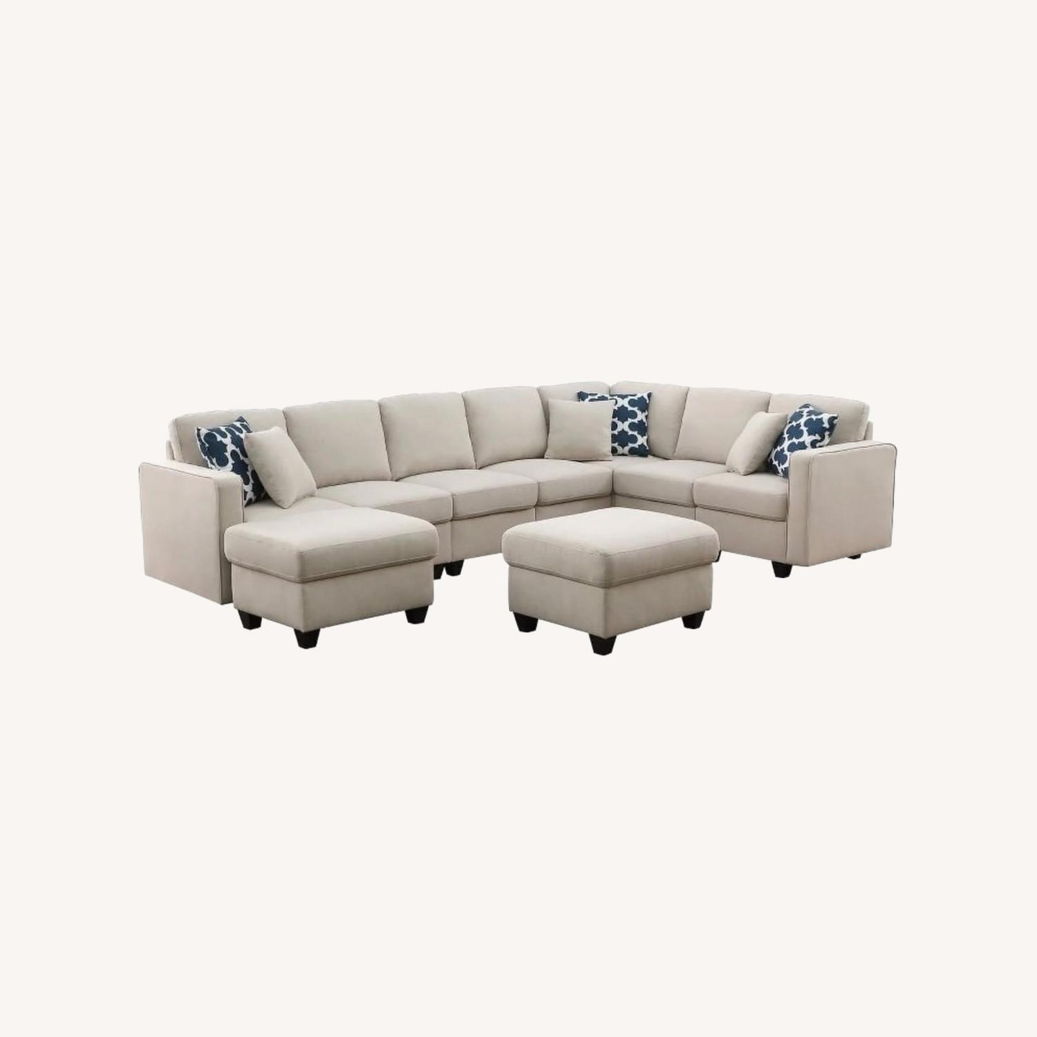 Seller's Notes:Create a cozy and inviting space with this 104'' L-shaped sectional. Featuring nine versatile pieces that can be easily arranged to fit your layout, it's made with an engineered wood frame and tapered block feet. Square arms and a loose cushion back give it a modern look. Wrapped in a neutral linen-blend fabric, this sectional is both comfortable and stylish, making it an ideal choice for entertaining or lounging with family. Plus, it comes with two ottomans and six contrasting toss pillows for added versatility and visual appeal. Seats 9 people, 6 toss pillows included. Each seating packed in a single box that is easy to load.