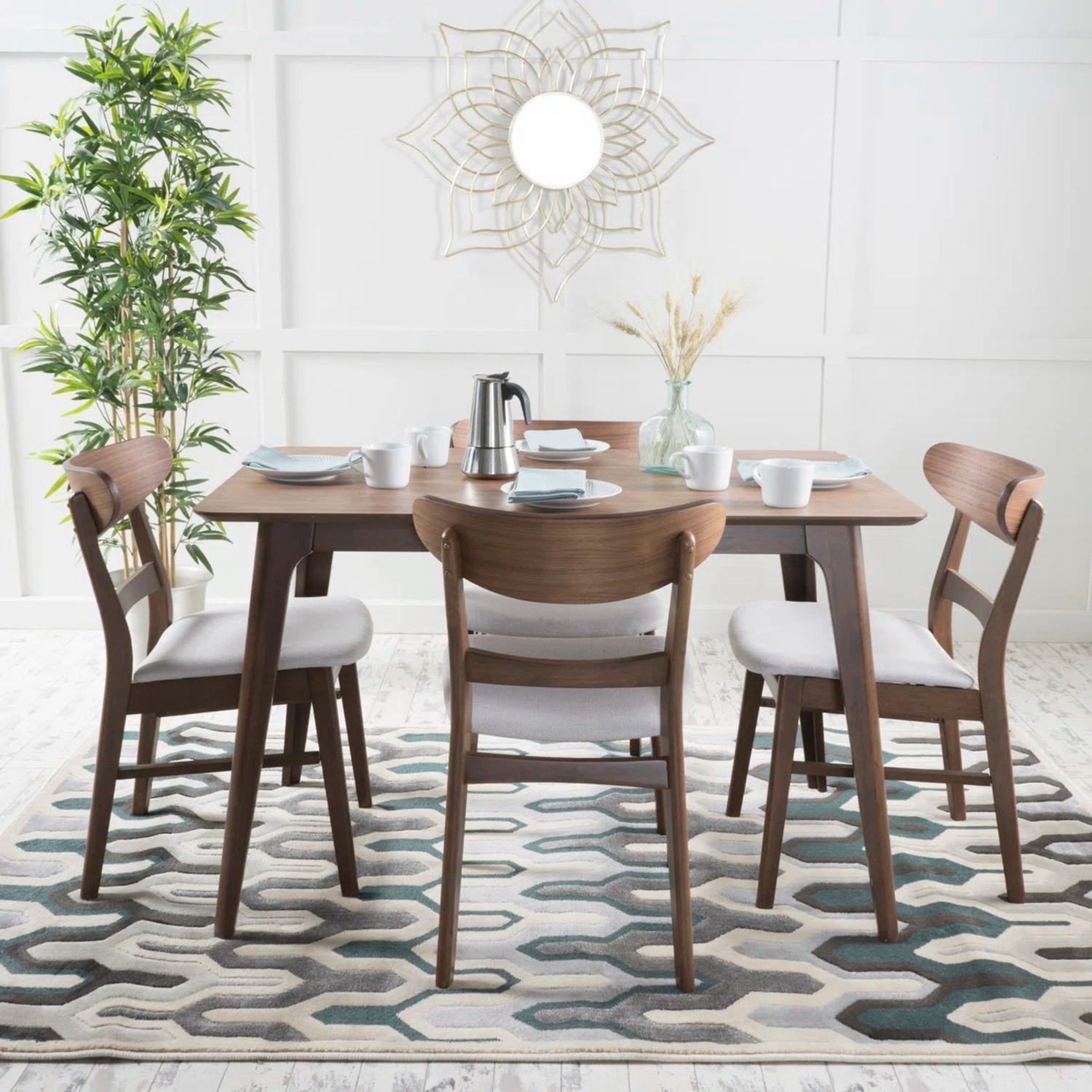With matching wood finishes, you can’t go wrong with this dining set. Including one table and four chairs, this set is ideal for any home. The mid-century style and smooth wood finishes of this set will complement any decor, making this a perfect addition to your interior space. The dining chairs feature a sturdy design with lovely upholstered seats that provide both comfort and style for your dining pleasure. Whether you are hosting a casual dinner with friends or dining with your family, this set will make every meal a memorable one.