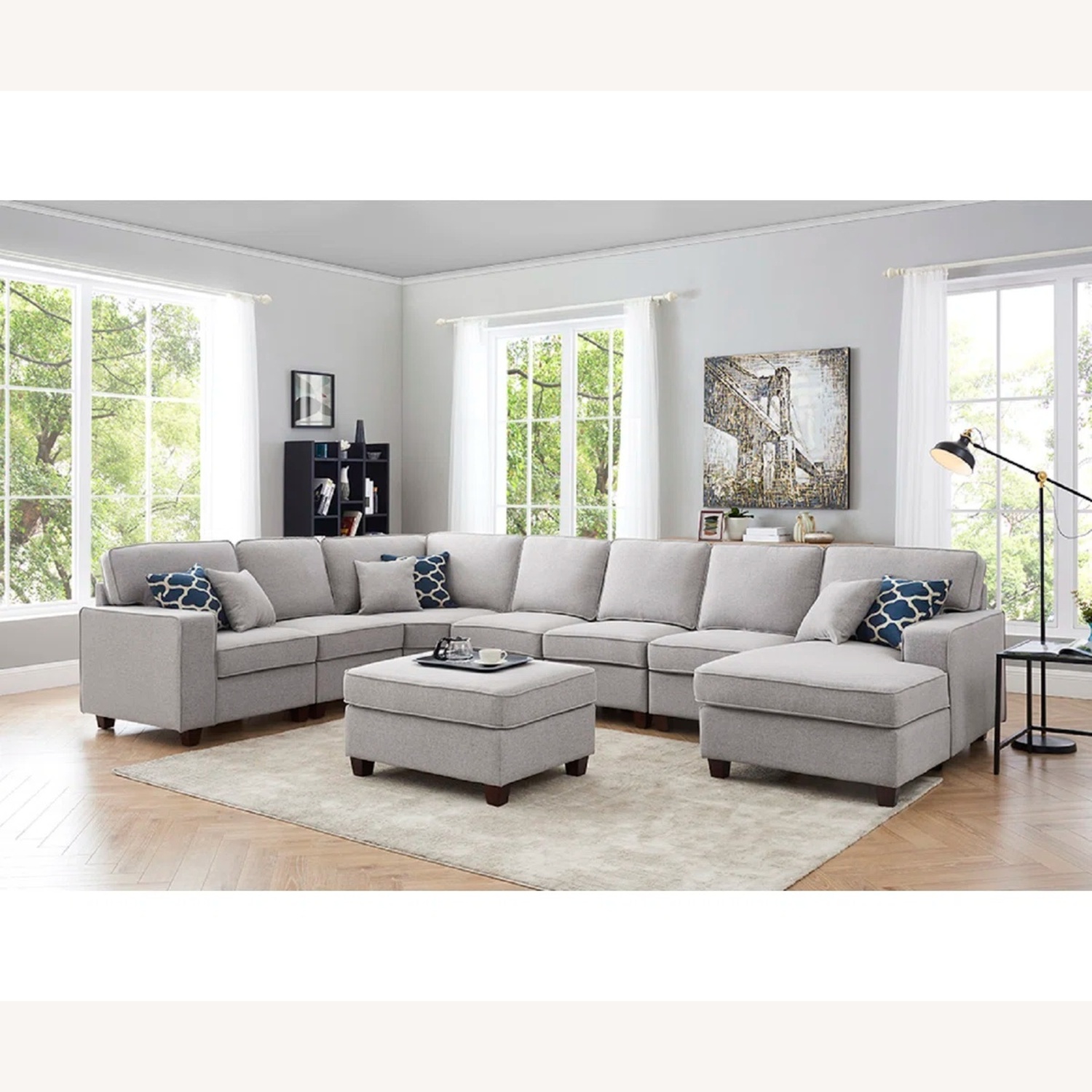 Seller's Notes:We love the streamlined styling of this 8-piece right-hand facing sectional sofa as it is an easy fit with so many design styles. The frame is made from solid and engineered wood; sinuous spring construction and foam are covered by a linen blend fabric. Slightly tapered legs, square arms, and a cushion back draw inspiration from traditional design. The chaise is ideal for relaxing after a long day or tuning into the big game, and the ottoman does double duty as a footrest or extra surface for a platter of snacks and drinks. Simply add side tables to either end of this couch and your living room is complete.