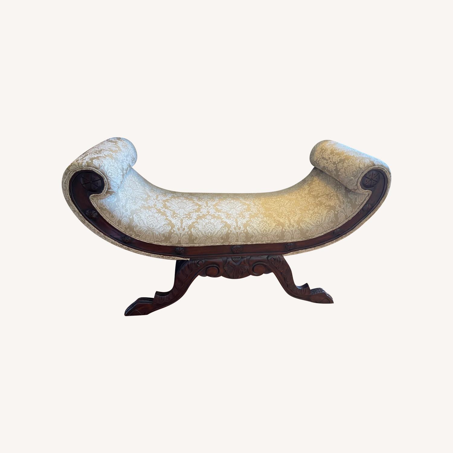 Seller's Notes:Authentic with character, this bench is hand-carved mahogany, hand-finished, and distressed just enough to replicate a true antique. With carved claw-and-ball feet, its angled legs rise toward textured golden wheat colored brocade jacquard upholstery that wraps around the great scroll arms, and blends easily with any décor.