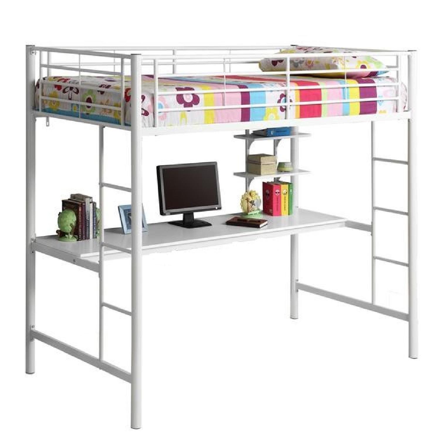 Seller's Notes:Less than a year old, this simple, yet contemporary twin-over-workstation loft bed that is great for space-saving living, college students and/or teenagers! A sturdy, steel-crafted frame with powder coated finish promises stability and function. Designed with safety in mind, this bed includes full length guardrails and integrated ladders on both sides of the bed. Again this bed is ideal for space-saving needs with a full work table top, pull-out keyboard tray and shelving for additional storage constructed of high-grade MDF. Features: • Stylish, contemporary design • Bunk supports 250 lbs. • Attractive powder-coated finish • Desk top and shelves made with high-grade MDF • Spacious work area with keyboard tray and shelving • Conforms to the latest consumer product safety standards • Ideal for space-saving needs • Support slats included, no box spring needed There is a dent on the southeast corner of the desk which happened during delivery.