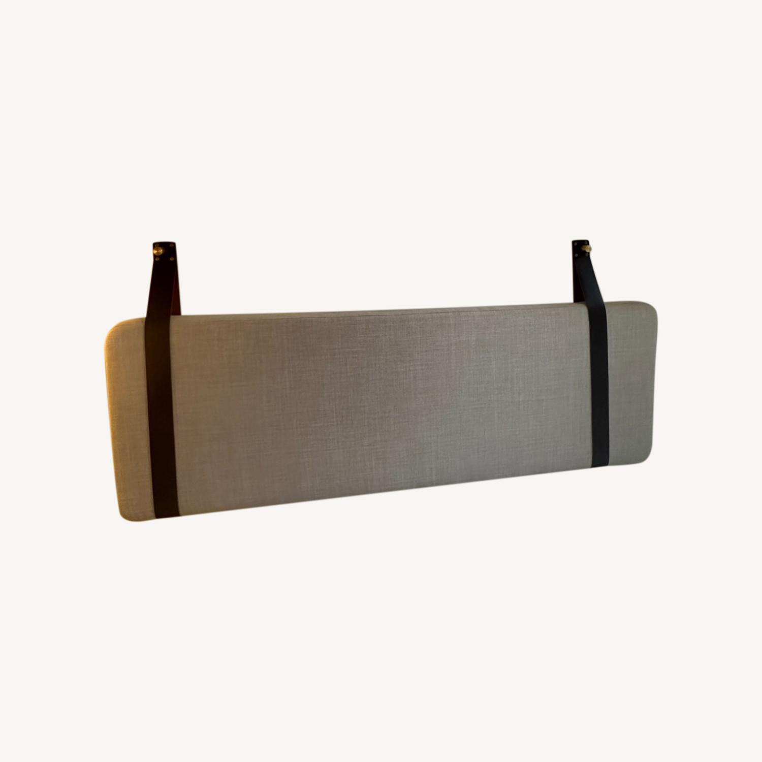 Seller's Notes:***only 2 years old. no damage, in like-new condition. cover removes and can be washed! 54" wide (full/double bed) / Cognac Leather / Gold This lightweight Beige Performance Linen cushion (no hard backing) is suspended from two leather straps which attach to your wall. Handmade to order in Los Angeles COVER MATERIAL: - Beige Performance Linen upholstery fabric - 100% poly performance fabric - zipper opening makes cover removable for cleaning - Spot clean, cold wash gentle, lay flat to dry, or dry clean INNER MATERIAL: - Lightweight firm foam insert with additional Dacron padding STRAPS + HARDWARE: - Cowhide straps, USA farmed leather - 2" wide, 25.5" tall finished - Gold tone metal hardware - The hardware accommodates #8 size screws.