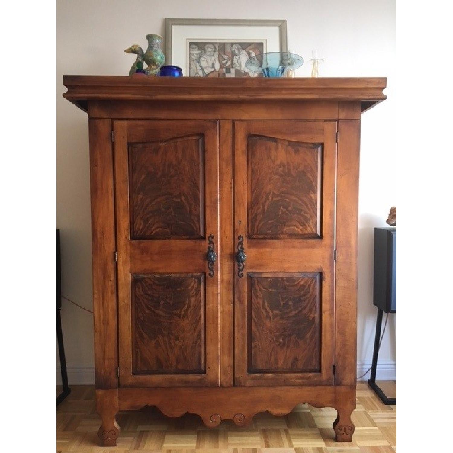 Seller's Notes:This furniture can be used as a Wall Unit or Armoire & comes in 2 pieces. The top part with latch doors sits on a solid base, but does not need assembly. The doors can fold flat to the side of the unit when opened. The depth of the top crown is 26.5" but the main cabinet depth is 23.5". The inside width is 46.25". The top shelf is adjustable and/or removable. It bows slightly in the center & does have a ding on the underside but does not show. Still very functional. Overall the unit looks like new.