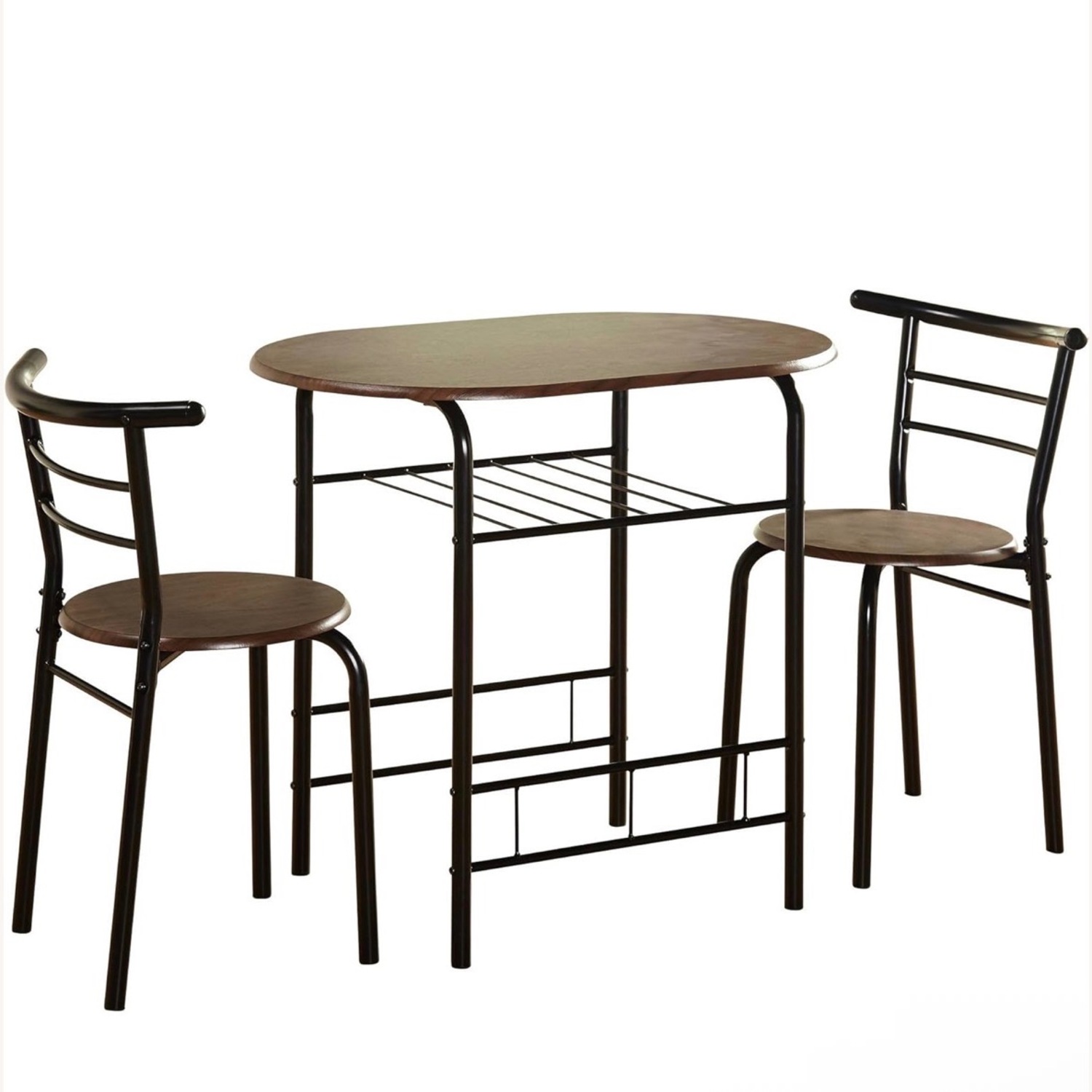 Seller's Notes:Perfect fit for a smaller space for 2 diners! It fit perfectly in our apartment. A slight wobble on the table that probably can be fixed with a screw tightening! 3-Piece Bistro Dining Set features one table and two chairs. This lovely indoor bistro set is constructed of particleboard with laminate and steel. The table has a convenient shelf for storing silverware, linens and other needed items.