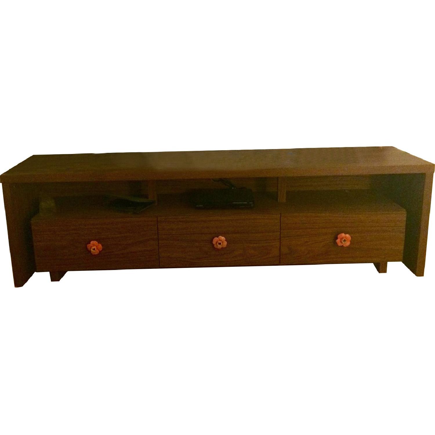 Seller's Notes:This Palma TV Stand with 3 Drawers, for TVs up to 70" is designed to fit any bedroom or family room. It offers an open area under its main panel of 6.5" high to store audio or gaming components and three storage cabinets. The Palma TV Stand with 3 Drawers is made of compressed wood with a paper laminate surface. Product in Inches (L x W x H): 70.75 x 15.5 x 20.0 3 storage drawers to store accessories, each size 20.7"W x 11.2"D x 9.2"H An area under its main panel of 6.5" height with 3 shelves to store audio or gaming components Made of compressed wood with paper laminate surface Wood-like finish Fits flat screen TVs up to 70" (maximum weight: 130 lbs) Included: flower drawer pulls and square wood drawer pulls that came with the stand Originally $139. Right inside panel has a crack but it does not have any effect (see photos)