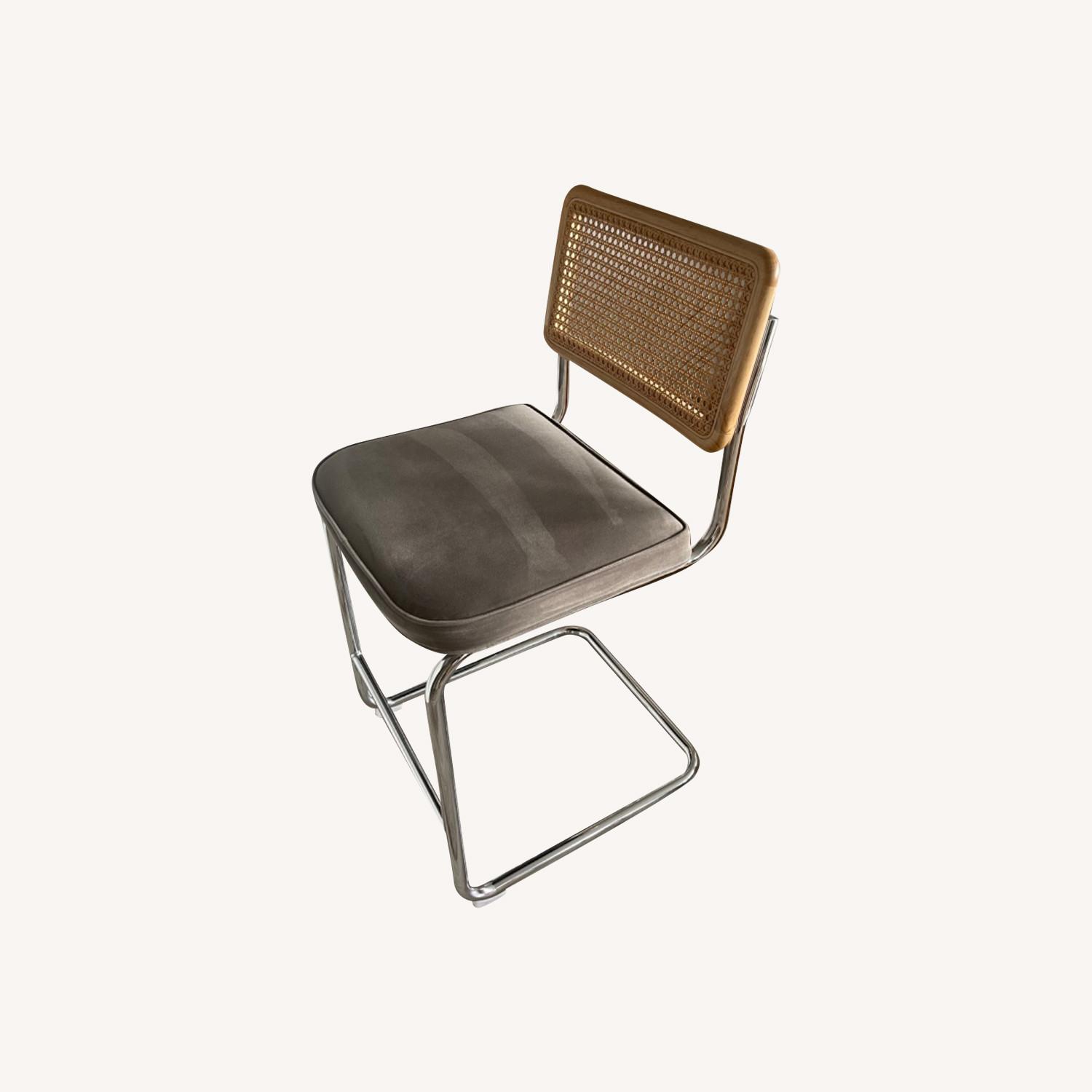 Seller's Notes:Features Classic look with an updated modern touch Solid wood framed back with natural cane insert Sturdy chromed steel frame Plywood seat with high-density foam padding Plastic glides to protect your floor With the look of a classic made even better with updated details, these stools will add an on-trend modern look to your room. Crafted on a durable steel frame with a beautiful chrome finish, these stools have a rectangular solid wood back with a natural cane insert just like the classic, but we have made it even better by adding a comfortable high-density foam seat upholstered in luxurious velvet with detail piping. Available in a variety of jewel-tone upholstery options, you are sure to find the one that is just right for you.