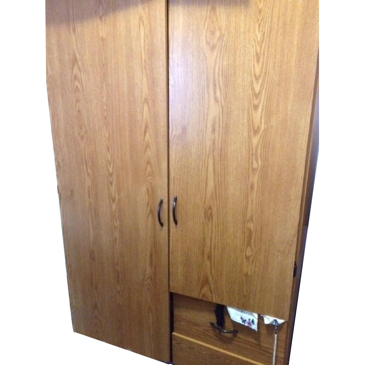 Seller's Notes:Up for grabs is a beautiful oak colored wardrobe closet with room to hang 50 prices of clothing, four storage shelves and two drawers. You can store your whole wardrobe in this one closet! Measurements are: 48 x 20 x 72
