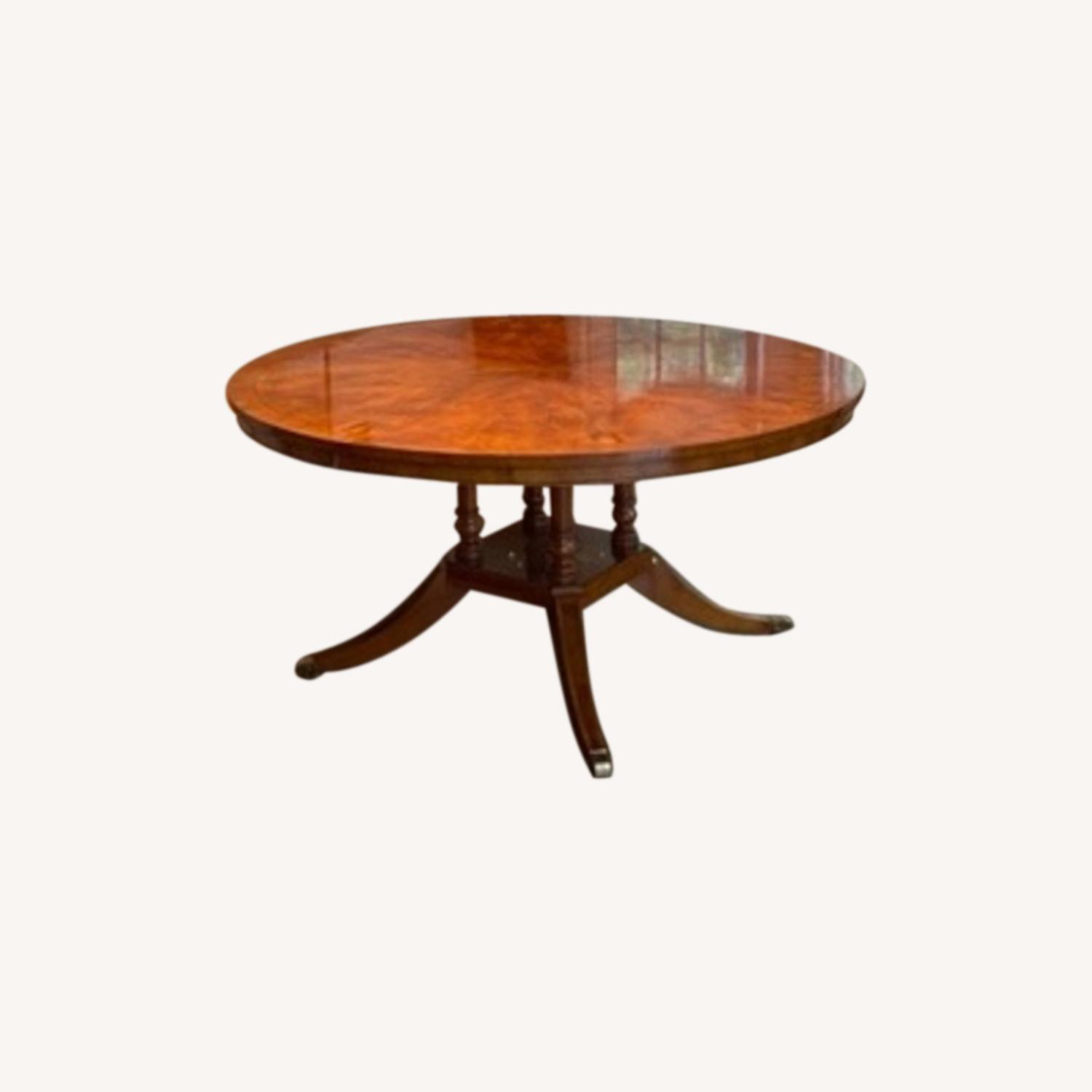 Seller's Notes:Table is 56 inches round and has two leaves that allow a seating of at least 12 people for dinner parties and holidays -- I often left the table open as friends and family would gather 'round and it was a standout showpiece but with warmth and inviting qualities. Purchased at The Mill House in Litchfield County, Connecticut -- this is one of my very favorite pieces -- as it is also sophisticated enough to be reminiscent of a Four Season's Hotel.