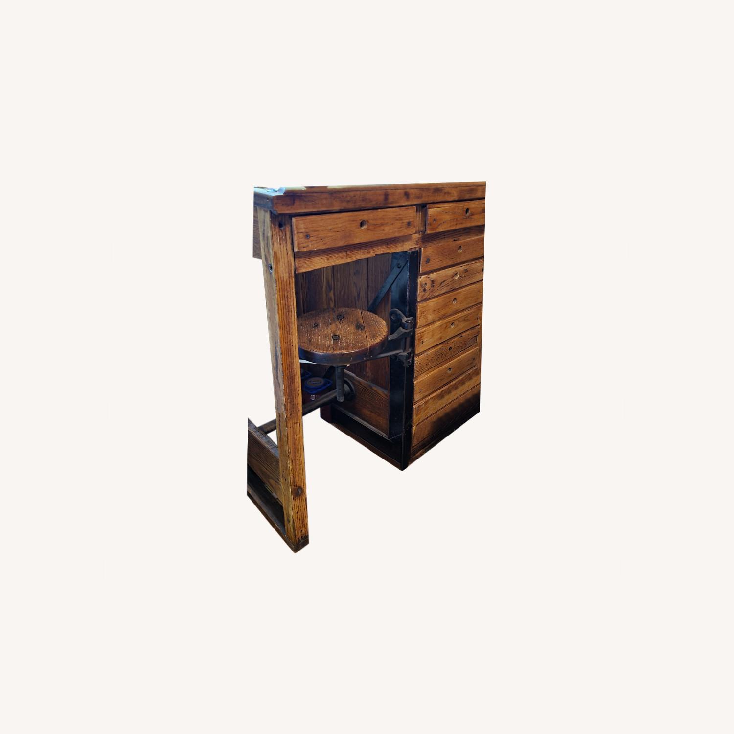 Seller's Notes:watchmakers desk, high desk with slightly slanted top, swing out stool is attached below the desk