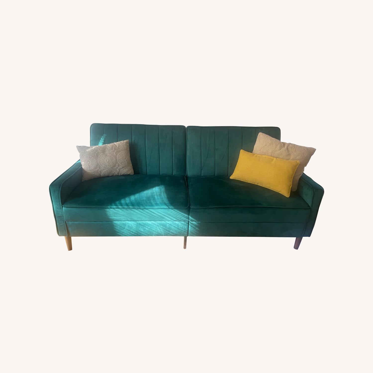 Seller's Notes:A nearly perfect condition velvet futon that can be adjusted into 5 different reclined angles and set back for a full size sleeper mattress. Storage pockets on both sides - two large pockets. There are added supports to the middle for extra stability. Very small blemishes We had it in our guest room which was hardly used.