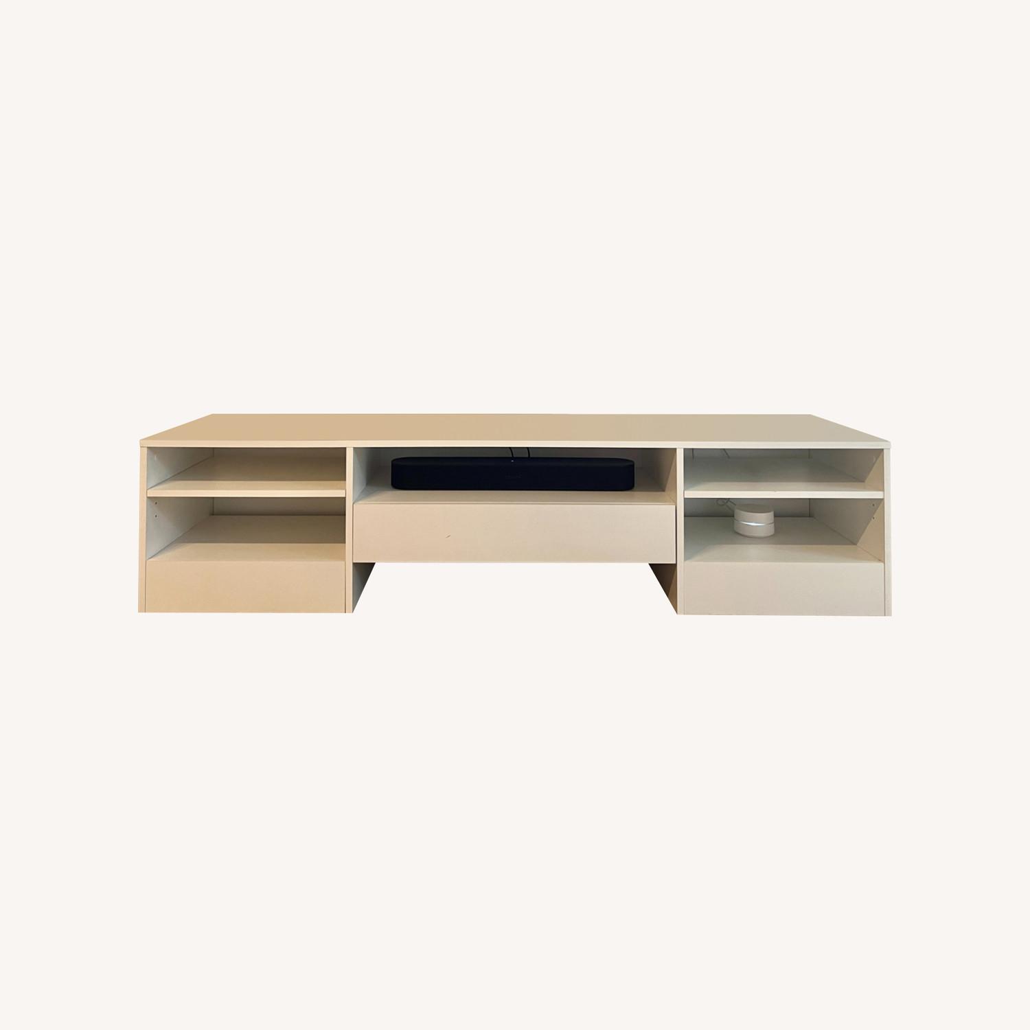 Seller's Notes:This TV stand accommodates flatscreens up to 80" wide. The open shelves are adjustable to accommodate items big and small. Features a cable management cutout on the back easily hides wires. The TV stand was purchased brand new from Wayfair less than 2 years ago. The bottom part of the center drawer is loose because I don't think I fastened it well during assembly. But other than that, it's in really good condition. Reason I'm selling this item is because I'm relocating to another county.
