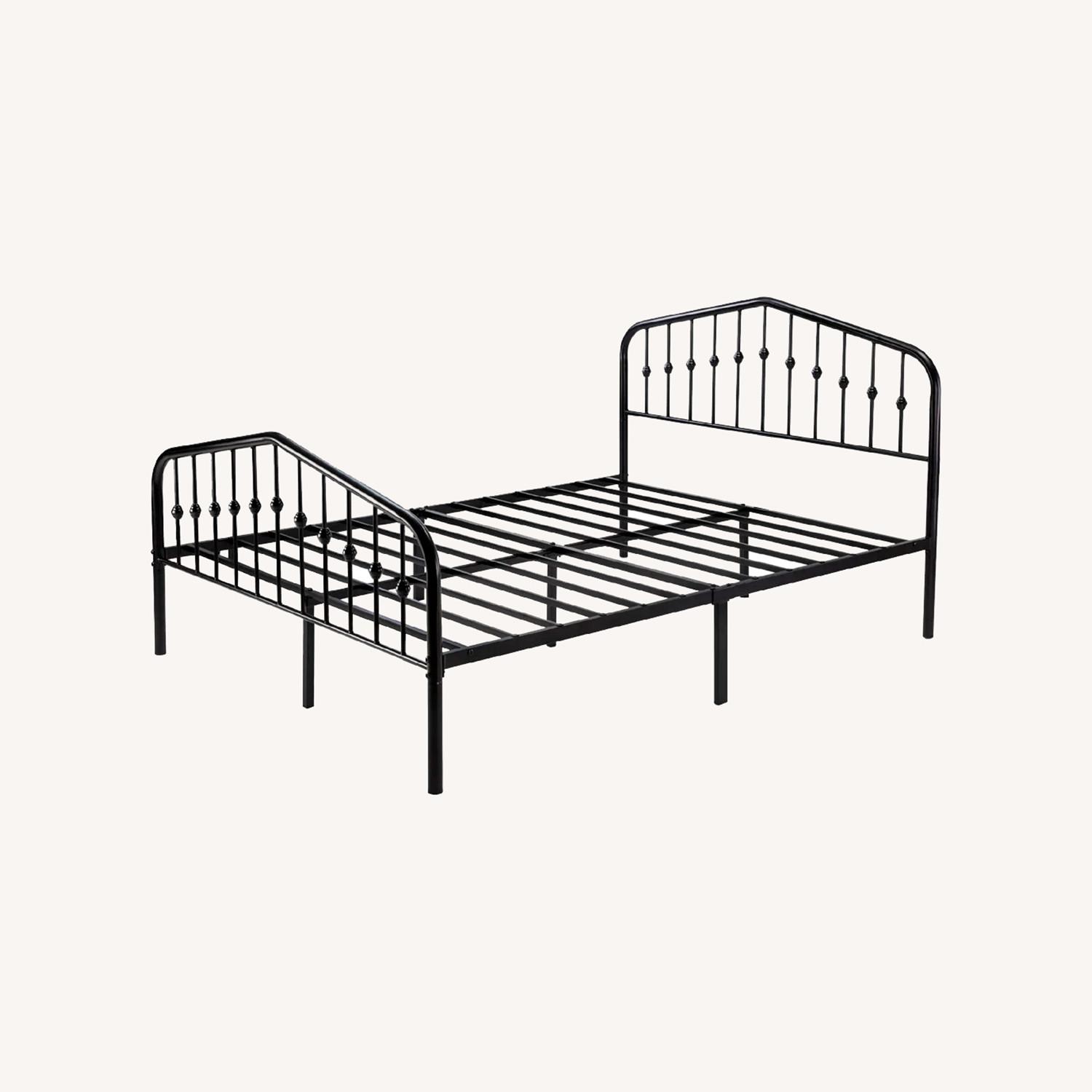 Farmhouse flair. This platform bed showcases vintage-inspired spindle accents and clean lines for a cozy, clean-lined look in your bedroom. The simple frame is crafted from metal with a matte black finish for a versatile design that complements a variety of color palettes. Both the headboard and footboard feature an arched silhouette that keeps pillows and blankets in place. This bed frame has center legs that provide additional support. We also love that the slat system does not require a box spring. Plus, it comes with a little over a foot of clearance space underneath for boxes, bins, and other items you'd like to store away.
