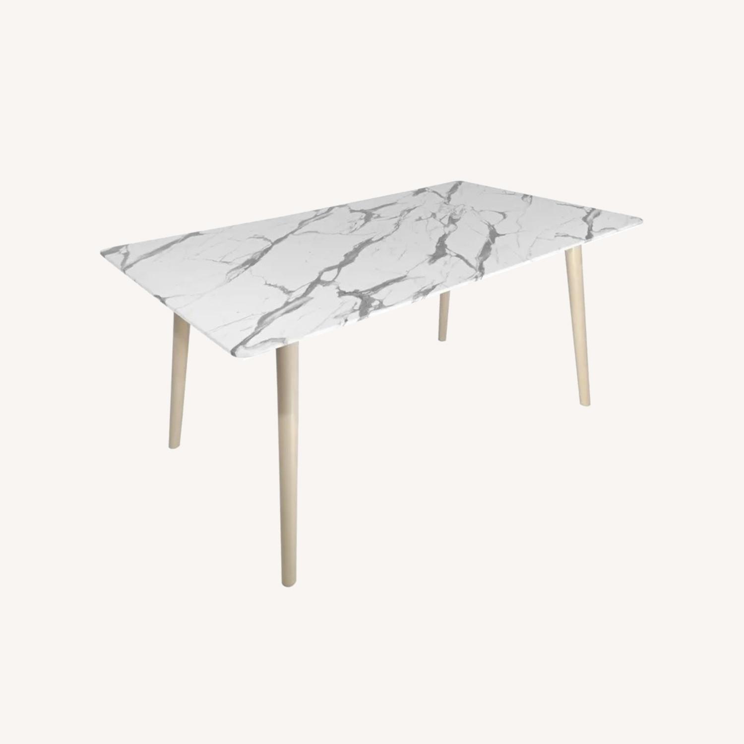 Seller's Notes:Sleek and modern marble dining table with cream colored wood legs that creates a timeless look for the home.