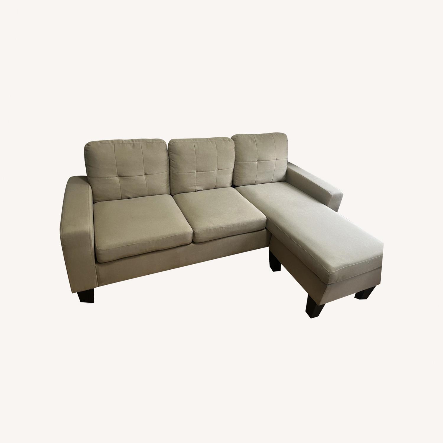 Seller's Notes:2 piece tan upholstered couch from Wayfair originally $490. The chaise can be moved to either side to move the L section. In great condition with minor pulls in the fabric (pictured). The fabric is removable and can be washed. I previously treated this with scotch guard so it is easy to clean. 76" wide, 43 " long for the L section, 23 " tall. Light weight and easy to move.