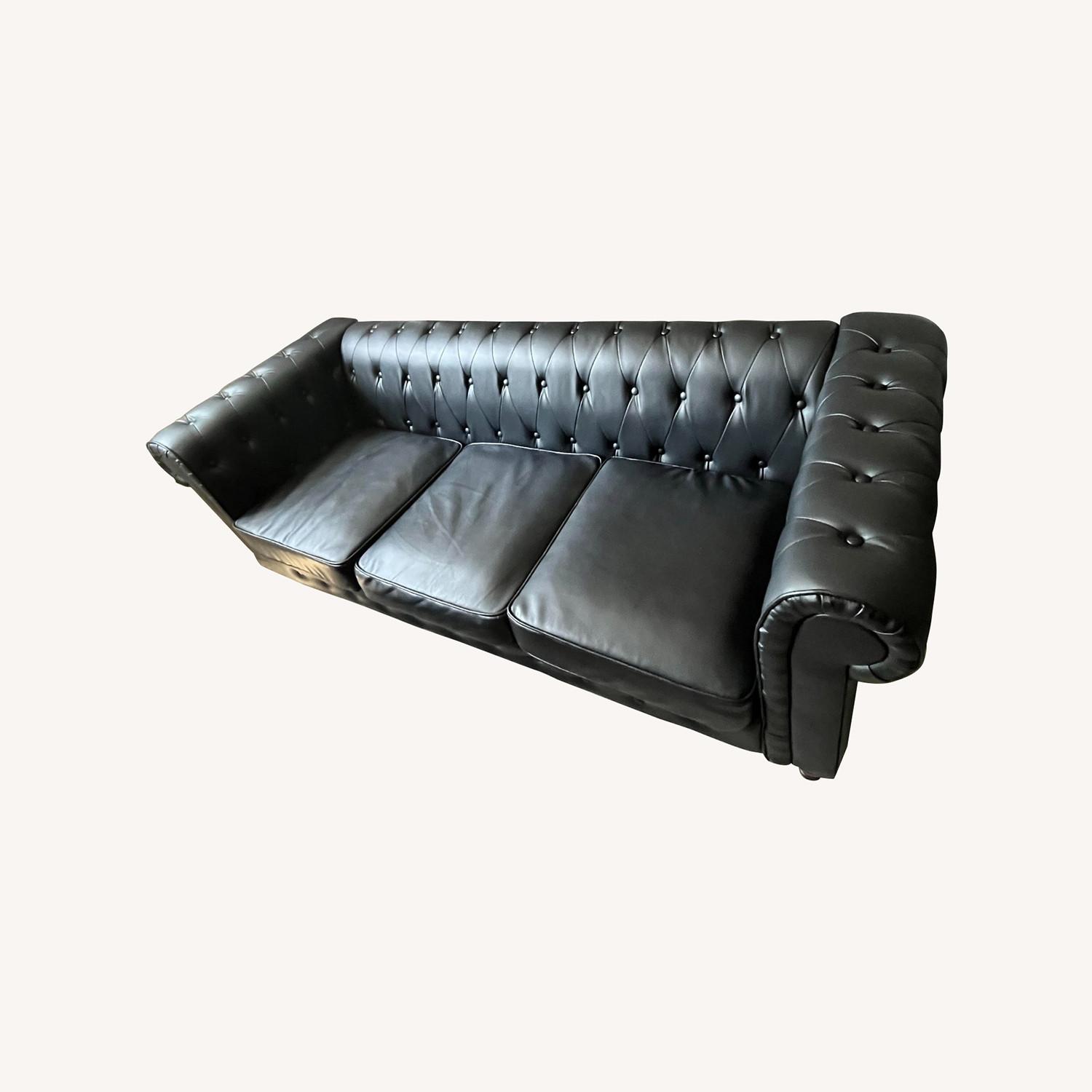 Seller's Notes:Great condition couch, very sturdy, good quality leather. No blemishes other than a very small rip on the back right corner that happened during the moving process. Beautiful button tufted design. Mahogany brown legs.