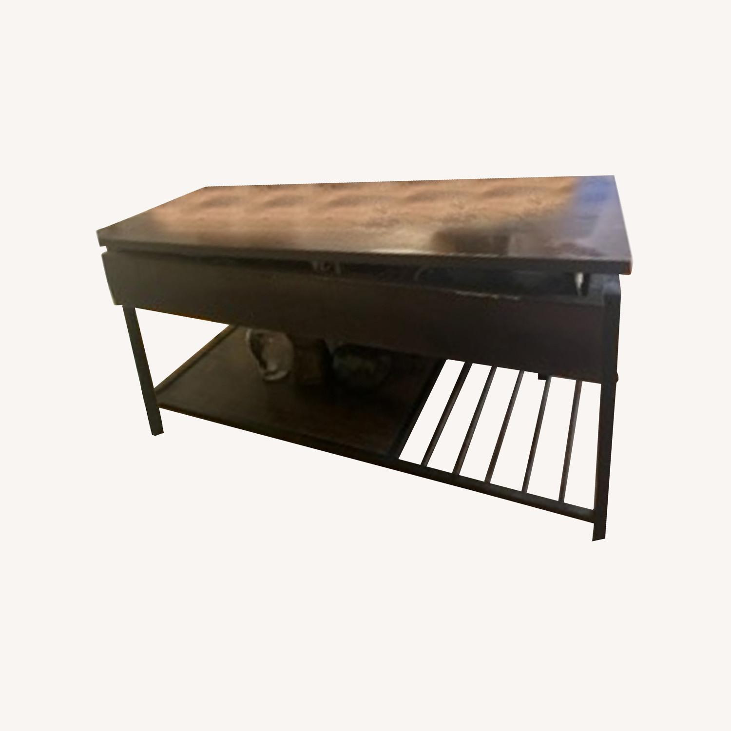 Seller's Notes:This lift-top coffee table features a unique design that allows the top to lift up and move forward to create a versatile surface for you to work on projects, browse online, or enjoy a delicious meal all while relaxing from the comfort of your own couch. Beneath the top surface is a hidden storage area that provides you with the perfect spot to stow away items like a collection of novels, your stacks of magazines, and spare blankets. The lower open shelf provides you with additional storage space for items like organizing bins and home décor. A black metal frame adds style and durability to this coffee table with a lift top. Also, this coffee table with storage is finished on all sides for versatile placement throughout your home.