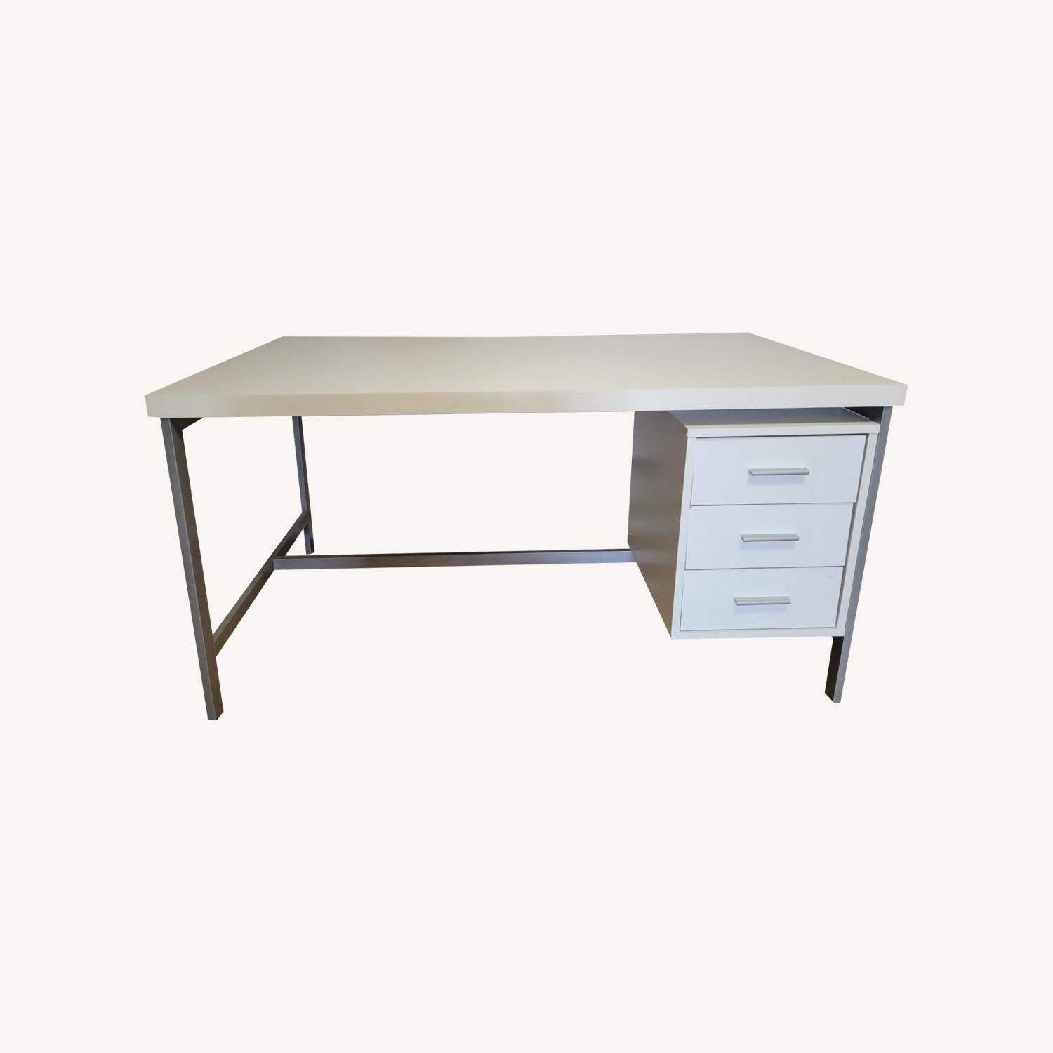 Seller's Notes:Create an industrial style with this white computer desk. The desktop supported by the silver metal frame generously stores all your office supplies. It easily adapts to any home, office, or living room space. The desk in good condition except when it was delivered bottom right hand corner chipped. Product Features: Features contemporary industrial style design in a white finish with silver-toned drawer pulls Depicts sturdy silver metal frame Ample surface space with a thick tabletop Includes 3 convenient storage drawers for your office supplies, paperwork Finished on all sides; looks great in a home or commercial office, or living room Recommended for indoor use only