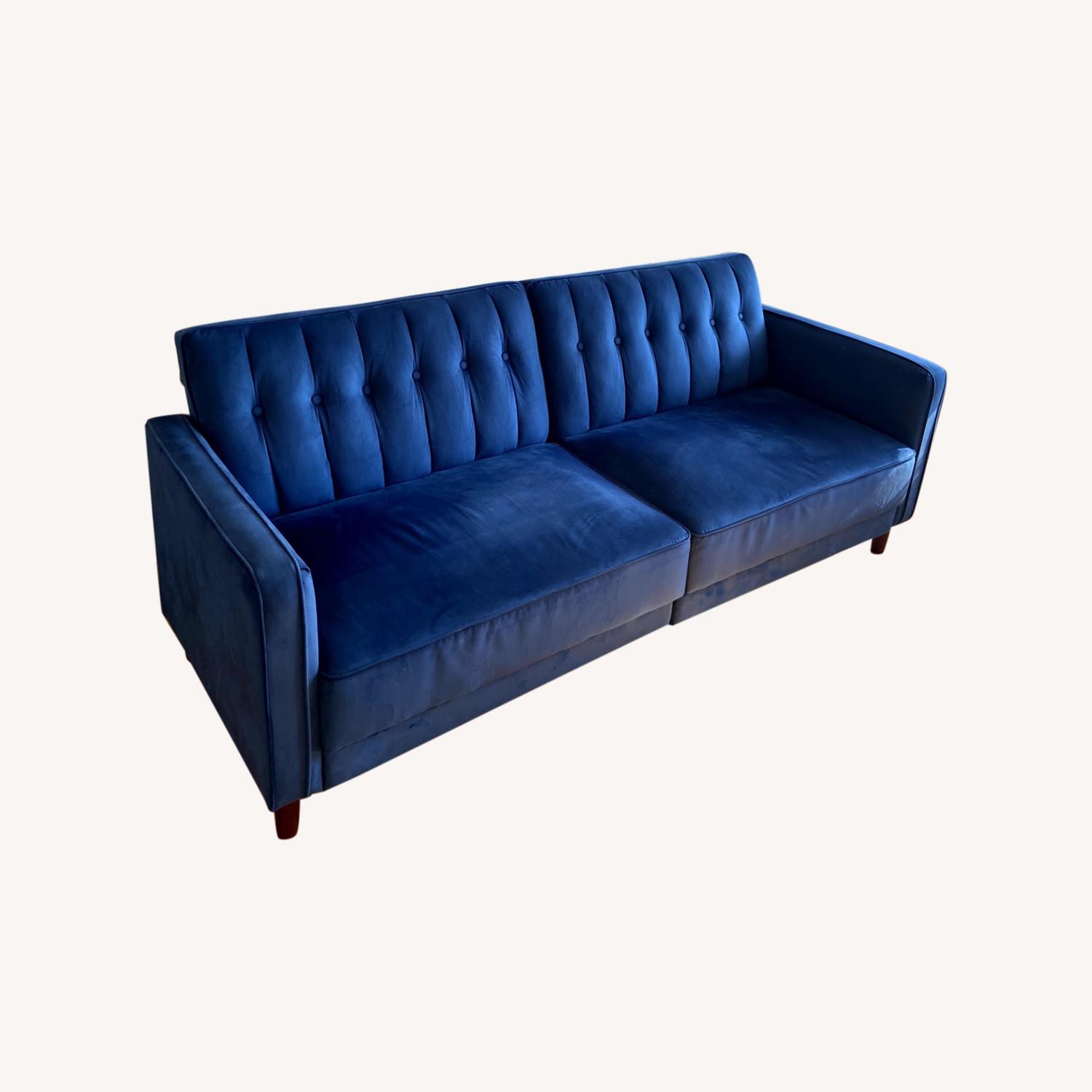Seller's Notes:Selling our convertible blue velvet sofa from Wayfair! It’s in great condition — only has a tiny burn mark on one of the cushions (see photo) that’s unnoticeable. It can be folded down to create a futon, making a perfect spot for guests. Only getting rid of as we have a larger couch coming! As an FYI, if you are planning to pick it up yourself, please make sure you bring another person to help move it down -- It’s not particularly heavy but we do live on the 4th floor (3 flights of stairs).