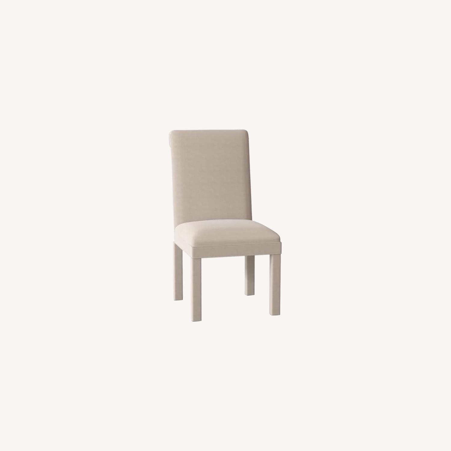 Seller's Notes:Parsons Chair w/ wheels which can be removed is in good condition. Can be used in office, dining room or for a bedroom vanity table. It’s a linen & cream & a few blemishes. Can buy a chair Parsons cover or not, either way it will be fine.