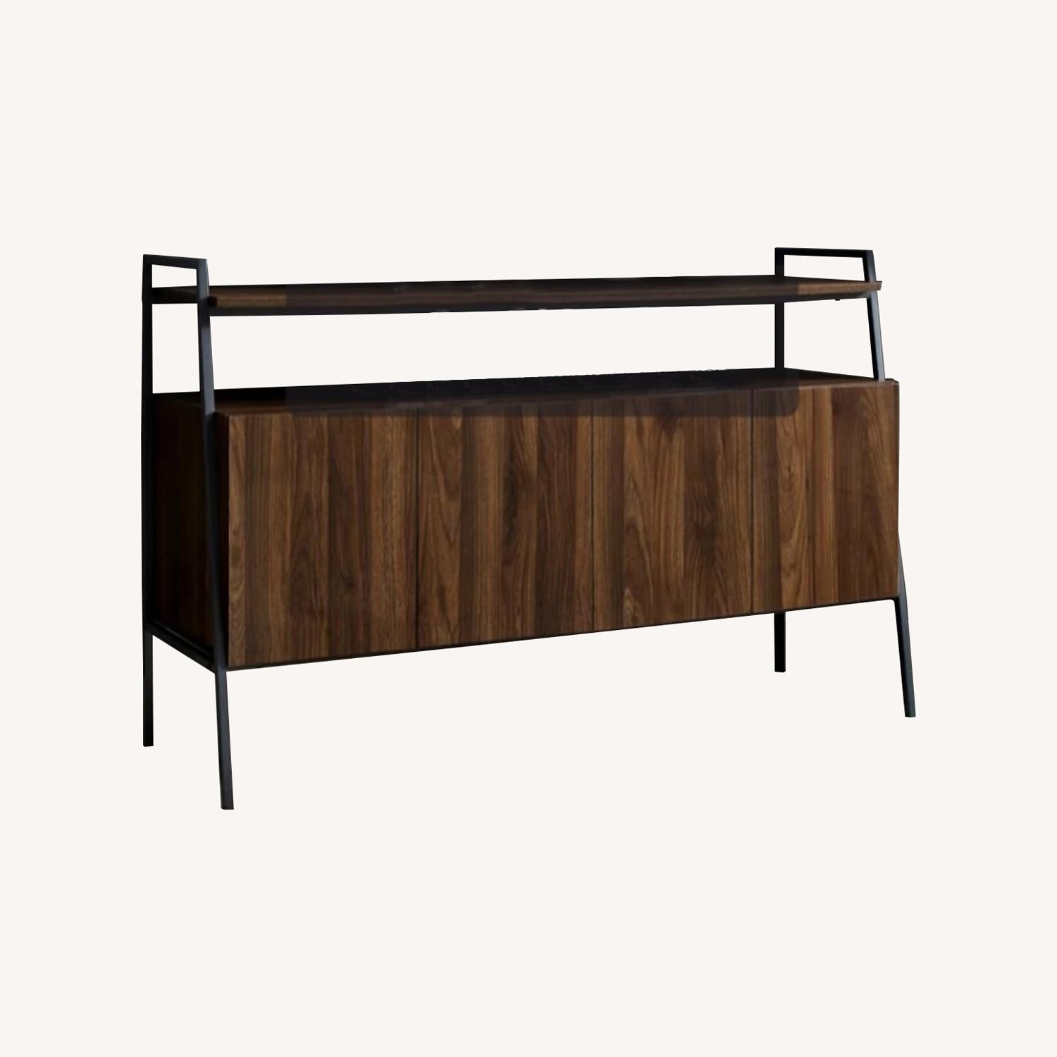 Seller's Notes:This TV stand is a sleek-looking piece of furniture that is easy to incorporate into your design scheme. Suitable for a 58” Flat-screen, the angled sides of this entertainment unit add visual interest. Four cabinets feature beveled door fronts, and soft close hinges, and have adjustable shelves that provide ample room for gaming consoles and accessories. Constructed of engineered wood with a natural wood grain-inspired façade, the powder-coated metal rod side supports and legs are an urban industrial look that we love.