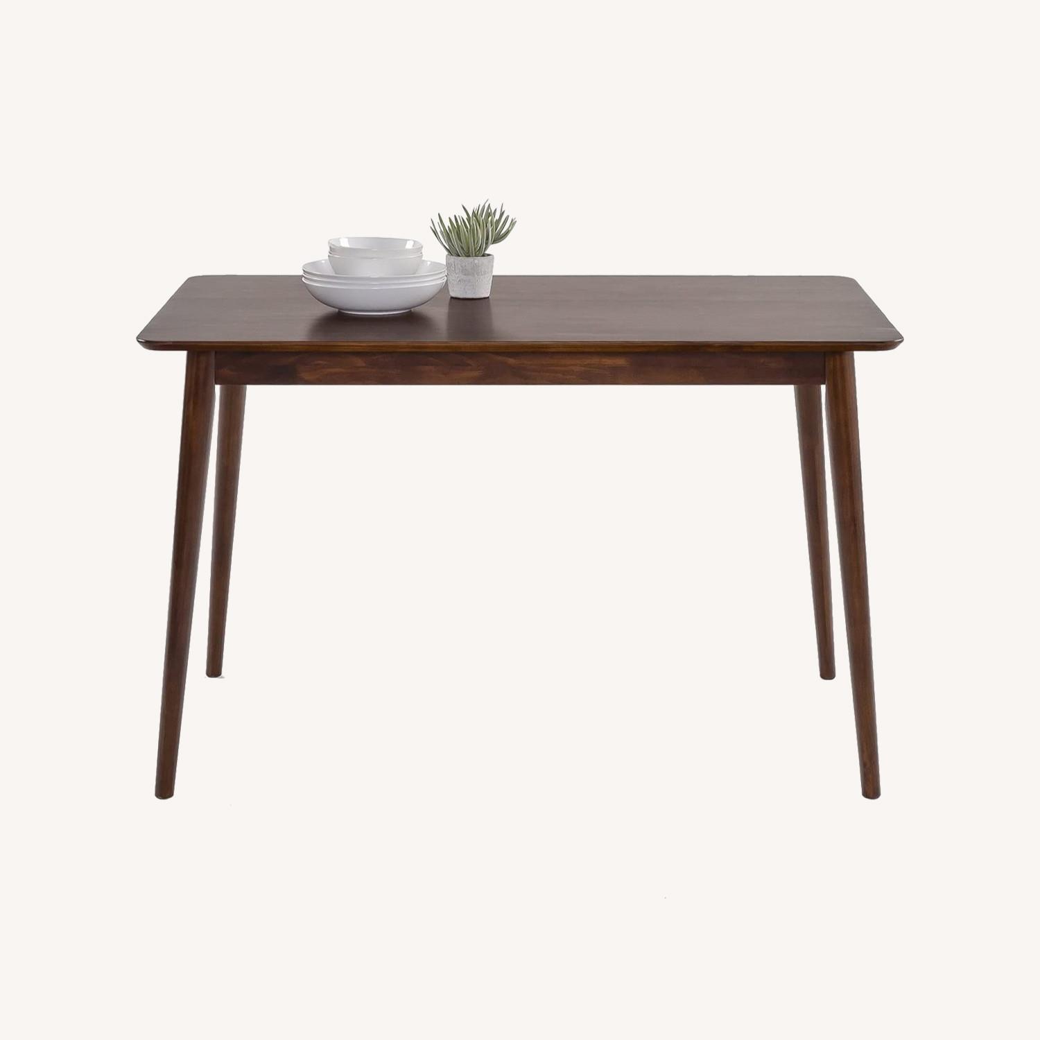 Seller's Notes:Inspired by classic mid-century design, the 47 inch Jen Wood Dining Table blends the natural beauty of solid wood with a compact, less-is-more silhouette. Crafted with round tapered legs and tabletop with rounded corners, this versatile piece refines a small dining area, nook or multipurpose room with understated elegance. It can comfortably seat 4 people and is made entirely from durable, solid wood with a finish that easily wipes clean.