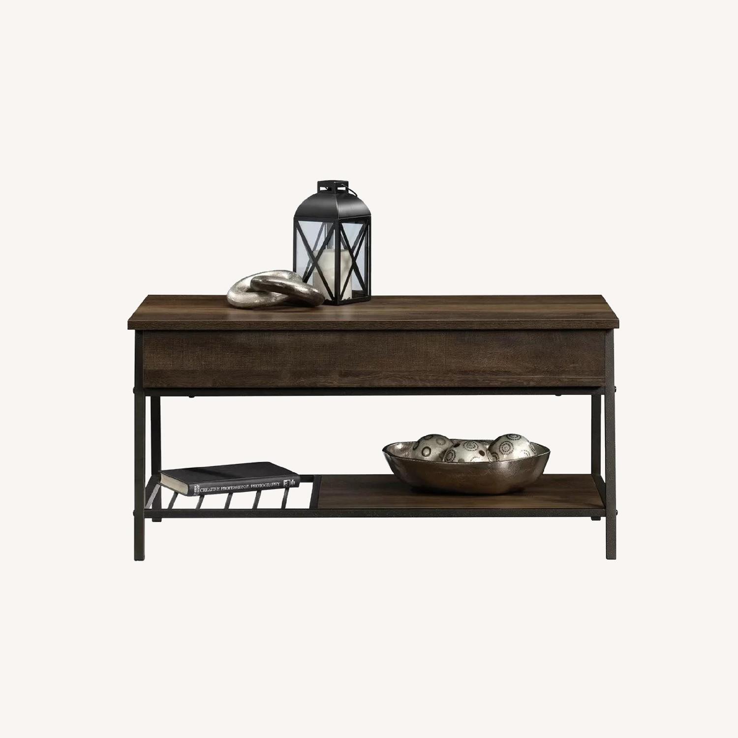 Seller's Notes:Less than a year old, great condition, dark wood coffee table. Lift up for eating/working/storing items underneath.
