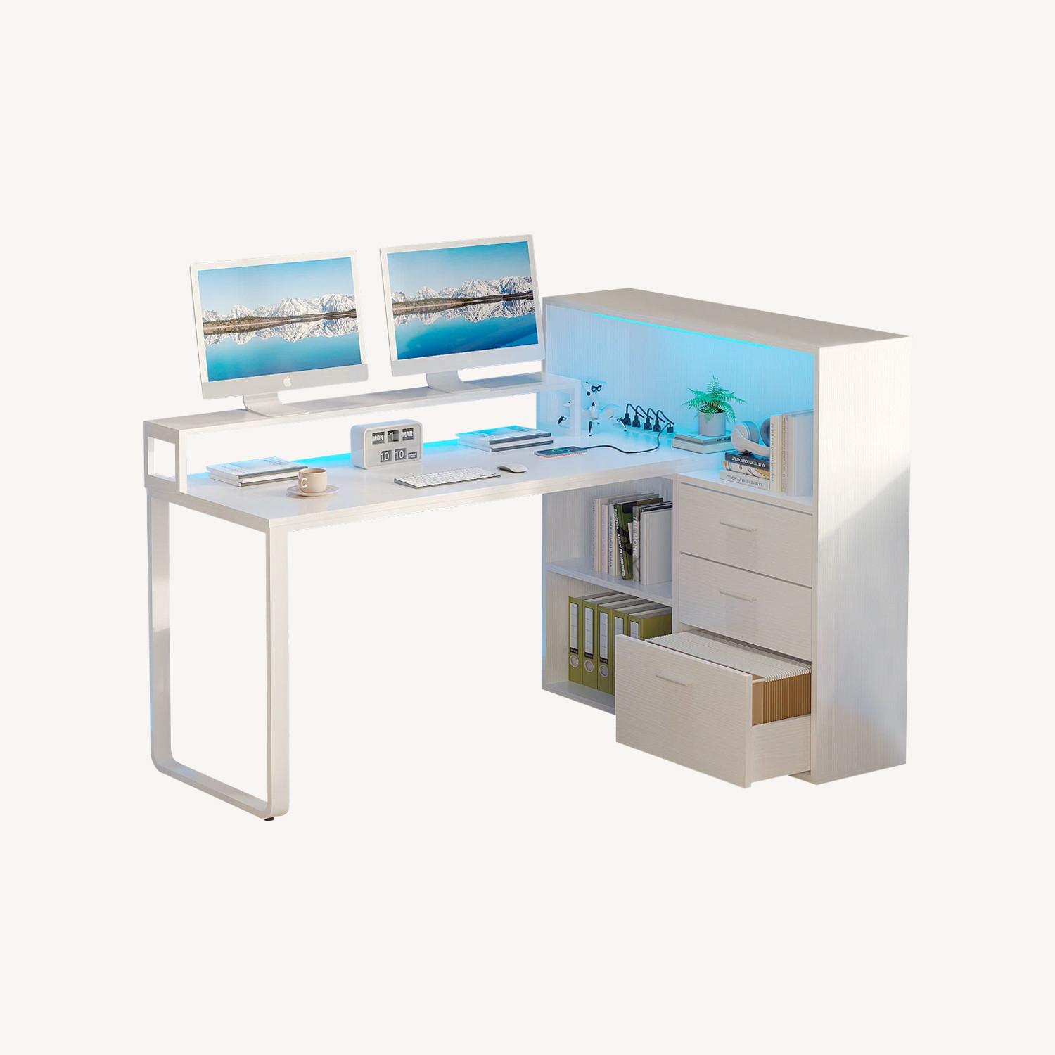 55 Inch Large Computer Desk with File Drawer,L Shaped Desk with Power Outlets & LED Lights & Monitor Shelf,Gaming Desk with 3 Drawers and 3 Storage Shelves,Home Office Desk with Bookshelf, White