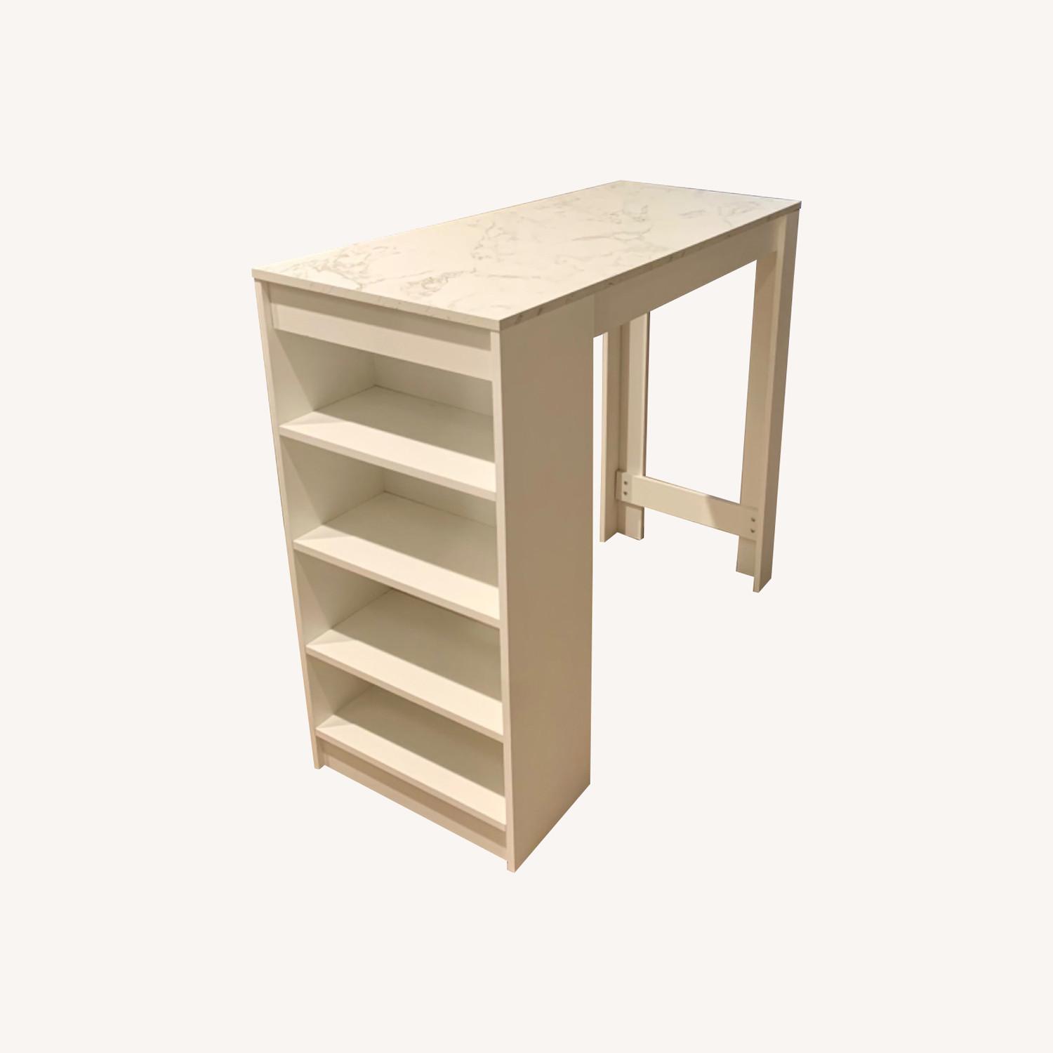 Seller's Notes:Already assembled Wayfair dining table. Color is white, with white marble-like colored surface. Perfect for small apartments and small kitchens that need a free standing island/dining table. Fits a bar stool underneath as shown in picture. Gently used. One year old.