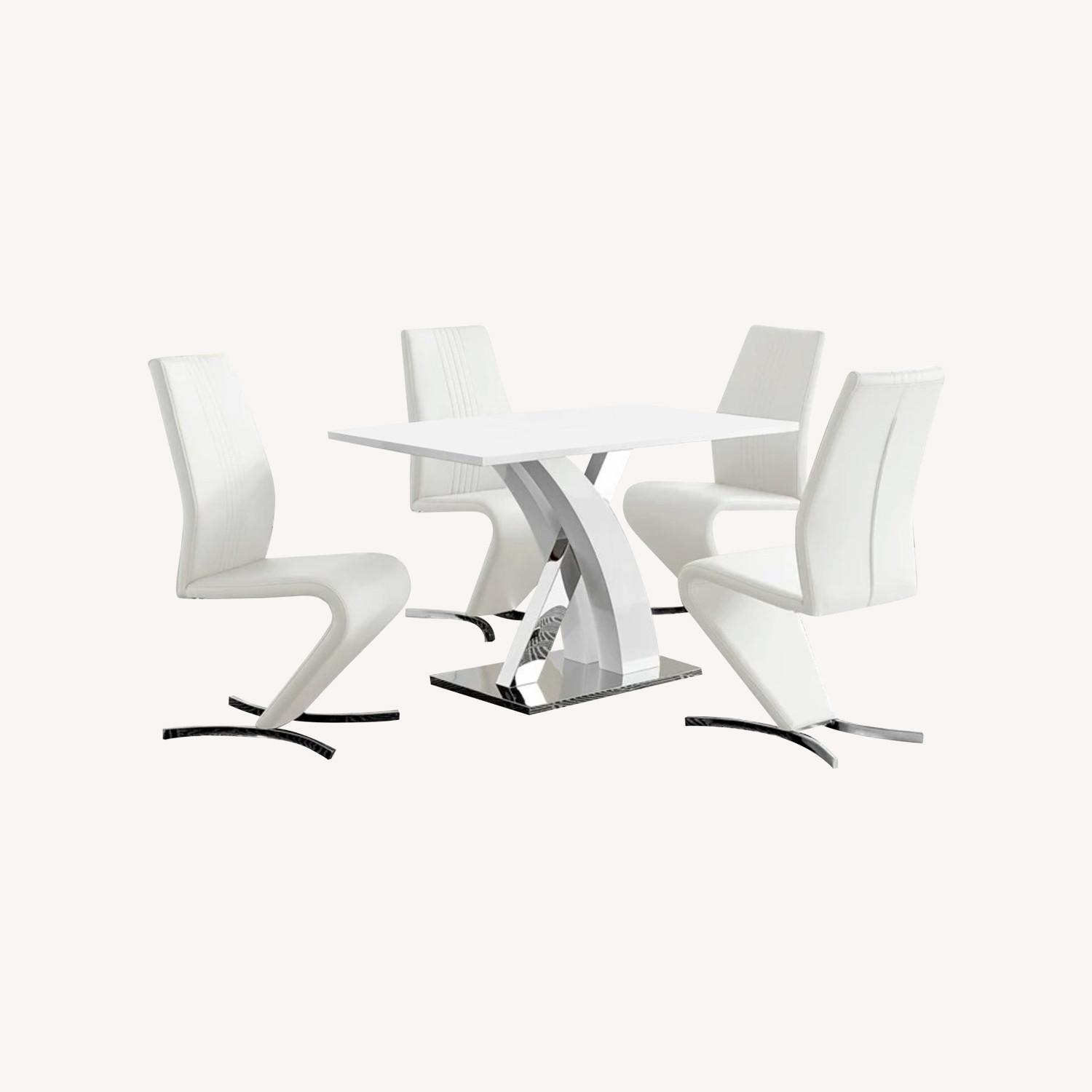 Seller's Notes:This dining set has a tabletop made from wood with a smooth high gloss coating, is easy to maintain, and offers plenty of room for dining with guests. It also has a unique and stylish combination of high gloss and strong chrome metal supporting the tabletop adding a modern and sophisticated touch.