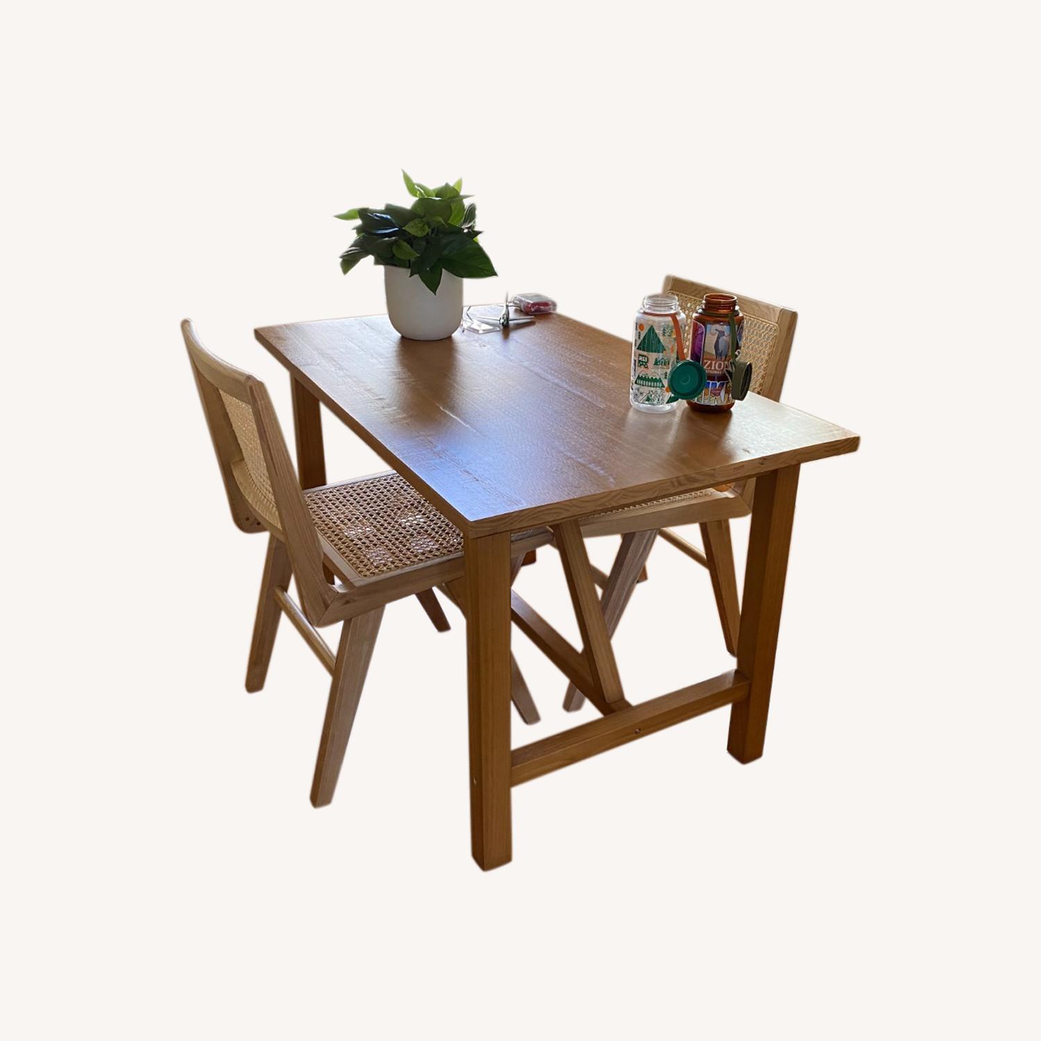 Seller's Notes:Lightly used, farmhouse style dining table with trestle, bought new from Wayfair. Light walnut wood. Seats 2-4 comfortably. My boyfriend and I used this table for 1.5 years, and bought a new dining table when we moved. Chairs not included.