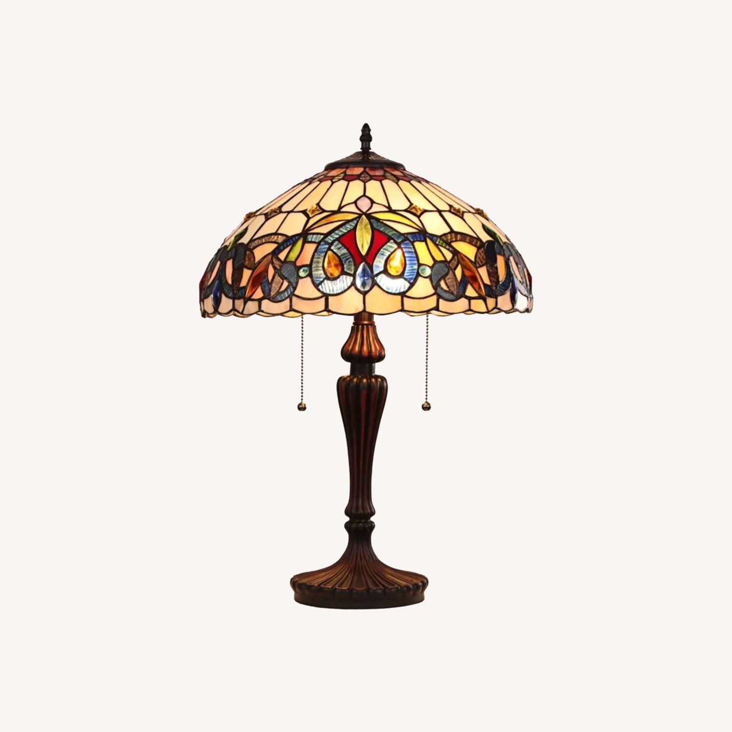 Seller's Notes:This is a beautiful Victorian-style 2-light table lamp featuring warm, colored stained glass. Each shade is handcrafted, using the same methods developed by Louis Comfort Tiffany in the early 1900s. This process entails using 330 hand-cut stained art glass pieces, 6 glass beads, and 36 crystals, each wrapped in fine copper foil and soldered together at extremely high temperatures to form each unique piece. The exact size to the nearest inch may vary, and the exact color of each glass piece may vary due to each piece being handcrafted. The first image is with the light shining through, the second image is with no light. Dry-listed and recommended for an indoor setting. ~SPDU