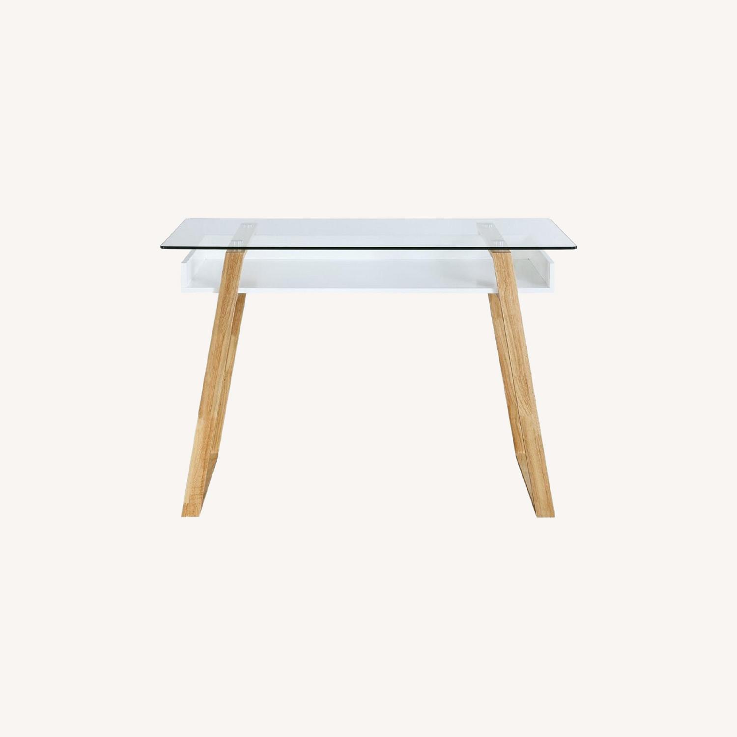 Seller's Notes:I bought this desk about five years ago, but it looks new! I took care of the glass top, and there are no real blemishes on the under part of the desk or the legs. The desk I linked to is a newer version of the same desk. The only reason I'm selling is that I bought a new desk for a larger space. Please note: this desk was in a home with one dog - no CATS.