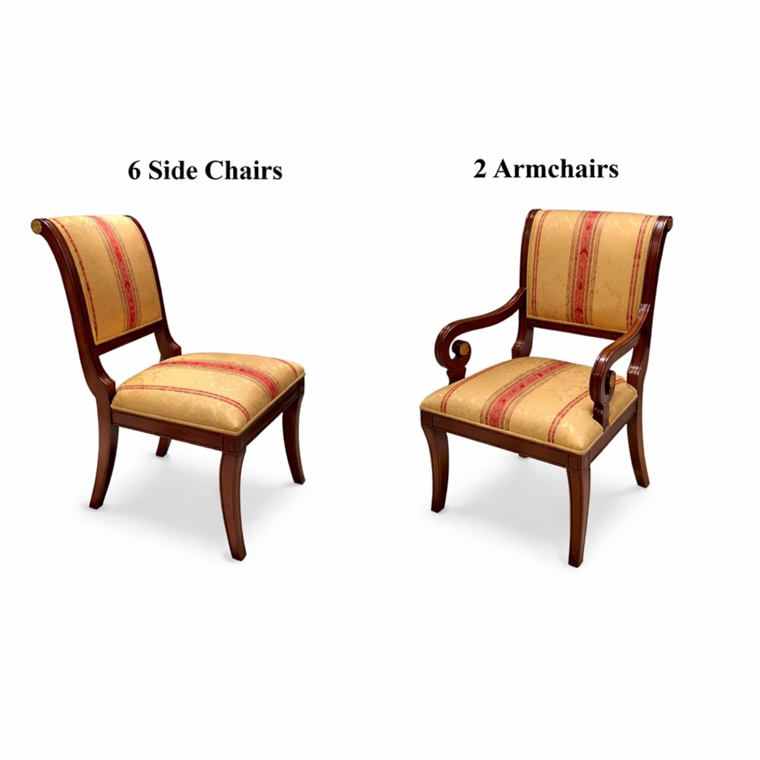 Seller's Notes:Indulge in the luxurious and sophisticated dining experience you deserve with this 8-piece Dining Chair Set. The set includes six side chairs and two arm-chairs, each adorned with exquisite round casting bronze ornaments and black decorated molding that exude elegance and refinement.As if that weren't impressive enough, each chair features a striking bronze tiger claw, symbolizing strength and courage, that will leave your guests in awe.The precious carvings and rare wood veneers used to craft these chairs are a testament to the unparalleled quality and attention to detail that goes into every piece. You won't find a dining set like this anywhere else.Impress your guests and elevate your dining experience to new heights with this 8-piece Dining Chair Set. Kindly note that the dining table is sold separately, but when paired with this set, your dining room will be the epitome of sophistication and elegance. Don't miss out on the chance to own this exceptional piece of furniture.
