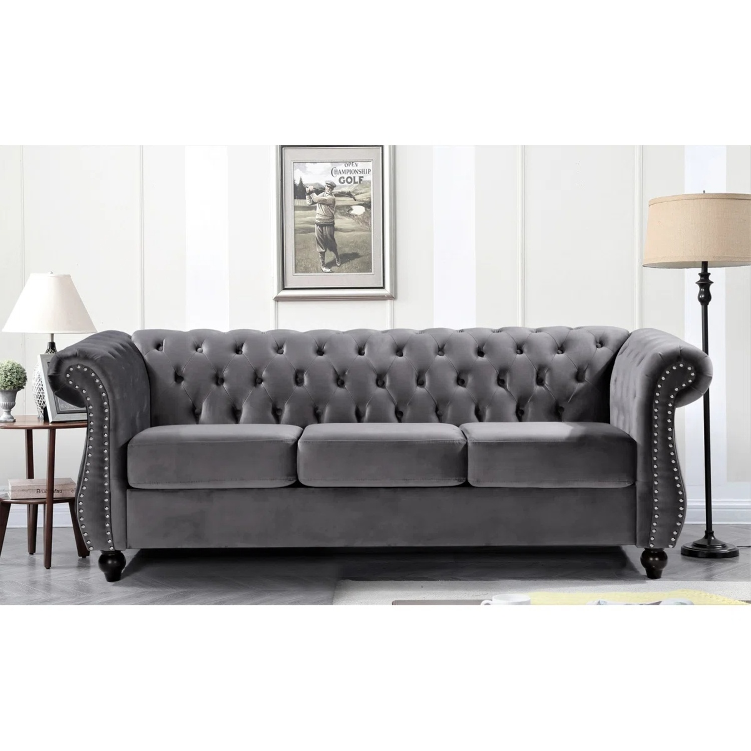 The perfect piece to reflect your regal tastes, this sofa anchors your seating ensemble in timeless appeal. this dapper design strikes an updated, clean-lined silhouette with tight pleated rolled arms and wood round tapered feet. brings out this sofa's glamorous side, while exquisite details including high-density foam filled with spring support, piped seat cushions, matching bolster pillows, and a button-tufted backrest elevate the design. With coordinating throw pillows. glamorous side, while exquisite details including high-density foam fill with spring support, piped seat cushions, matching bolster pillows and a button-tufted backrest elevate the design. With coordinating throw pillows.