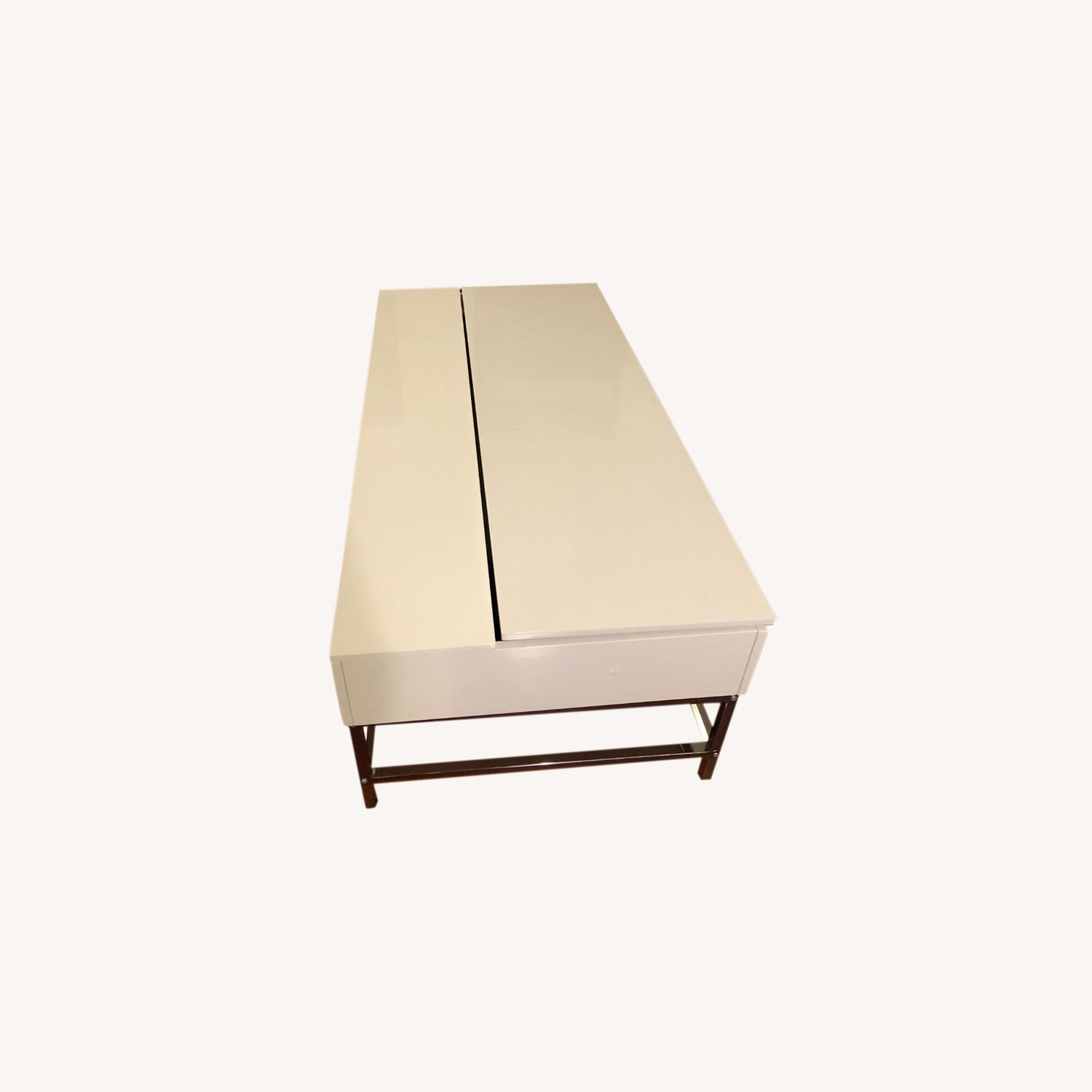 Seller's Notes:Lend your living room layout a splash of streamlined style with this modern coffee table, featuring a lift top that lets you raise its height from 17.8" to 21.3" as you eat or work from home. Founded atop an open metal frame in a chrome finish, its rectangular top is made from manufactured wood in a white lacquer finish for a sleek touch.