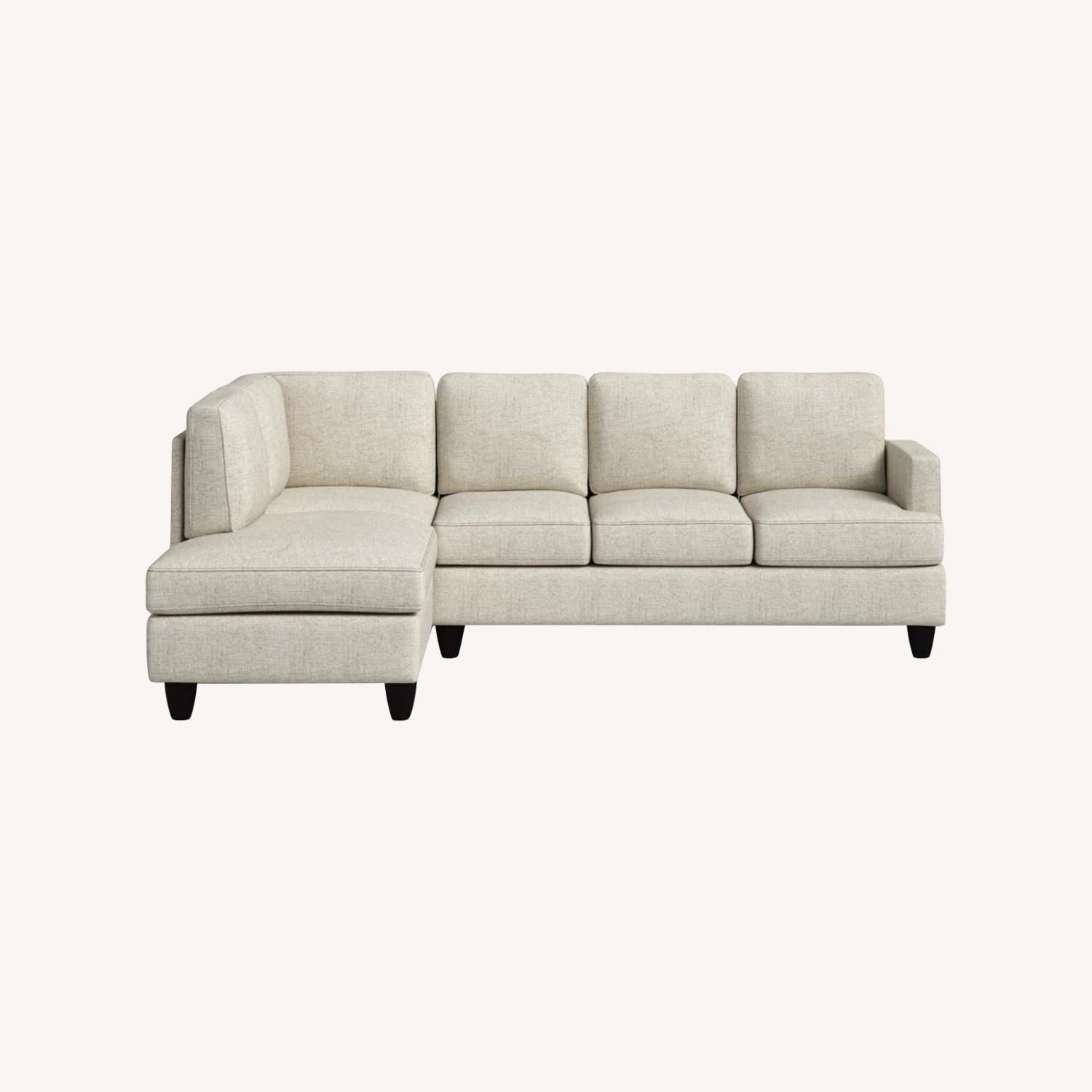 This sofa-and-chaise sectional features an L-shaped design that seats four people, ideal for game night or a movie marathon. It has an engineered wood frame that rests on tapered black-hued resin legs for a bit of modern style. Wrapped in a textured polyester blend fabric, this sectional easily works with a variety of styles and color schemes. With a mixture of foam and cotton filling, it provides you ample support as you stretch out and relax after a long day. A square side arm and cushion backs round out this traditional look. A minimum door width of 33" is needed for home entry. Full assembly is required, and all tools are included.