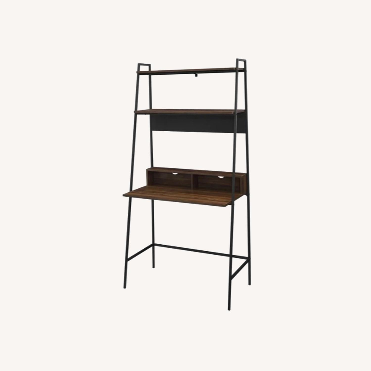 Seller's Notes:Ladder desk purchased on Wayfair. Has small specks of discoloration demonstrated in the picture provided though I find them almost unnoticeable when I have my keyboard and mouse on the desk. Great for cord management and has a magnetic board behind it to post up notes.